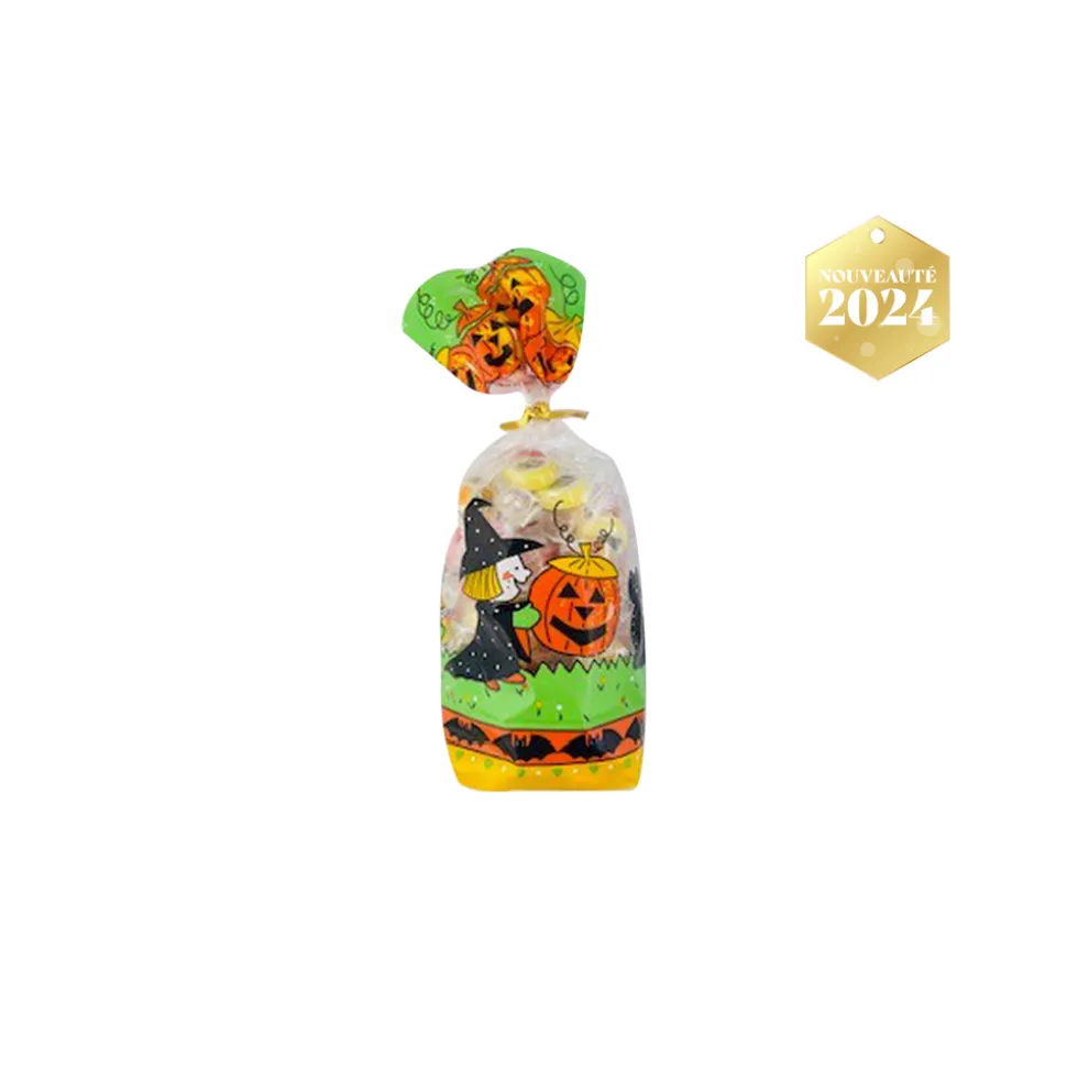 Ce sachet de bonbons est parfait pour Halloween avec son emballage orné d’adorables citrouilles. Il est idéal pour les effrayants monstres venant toquer à votre porte pour Halloween ! Sachet de bonbons Halloween 220g.