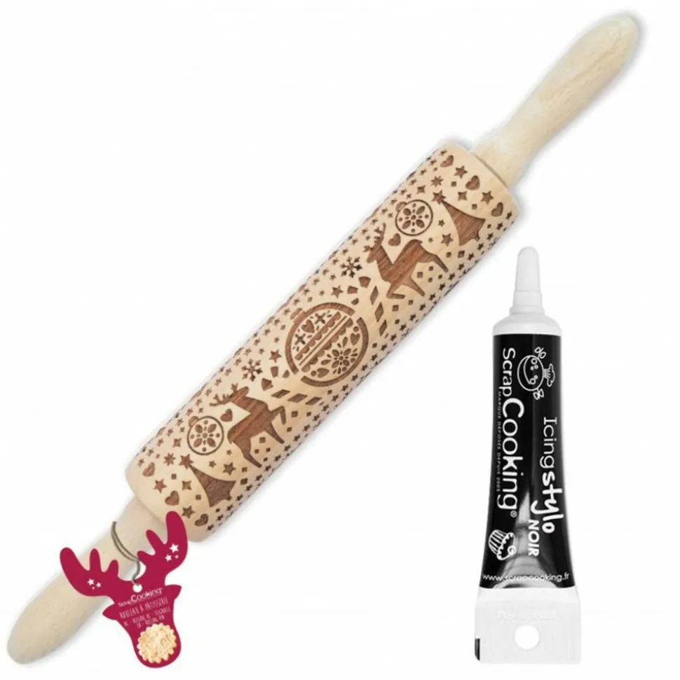 Ce rouleau en bois donnera du relief à vos biscuits sur le thème Noël. Grâce à sa gravure, le motif s’imprimera parfaitement dans la pâte et reste après cuisson. Pour la recette c’est à vous de jouer ! Laissez libre cours à vos envies et à votre imagination !. Ingrédients préparation sucrée gélifiée noire : sirop de glucose (45%), saccharose (40%), eau, agent gélifiant : E406, colorant : E153, arôme, acidifiant : E330, conservateur : E202.