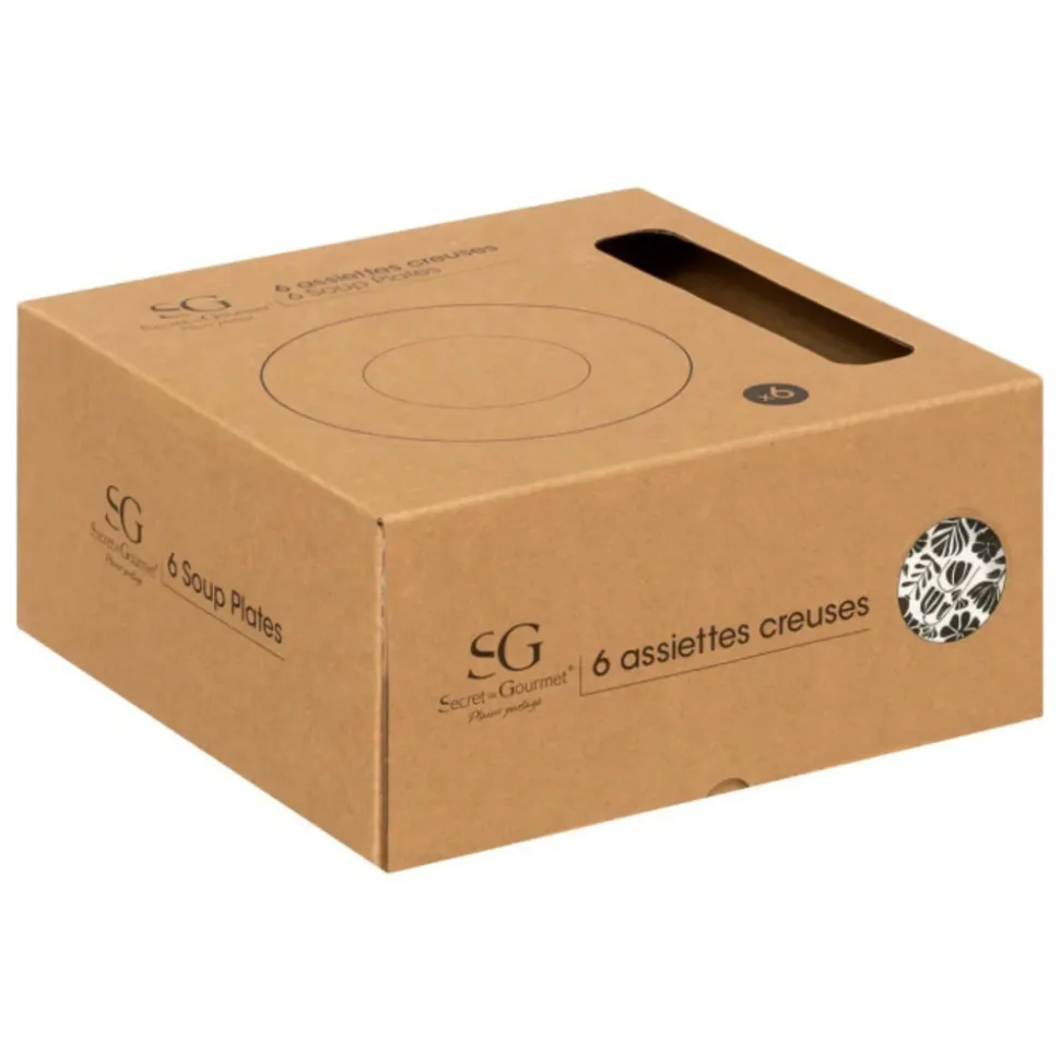 Dimensions : D. 20 x H. 4,1 cmMatière : PorcelaineSpécificités :Original & UtileLot de 6 assiettes creusesImprimé floralDesign bicoloreForme rondePoids : 0,41 kg (à l’unité)Couleur : Noir & Blanc