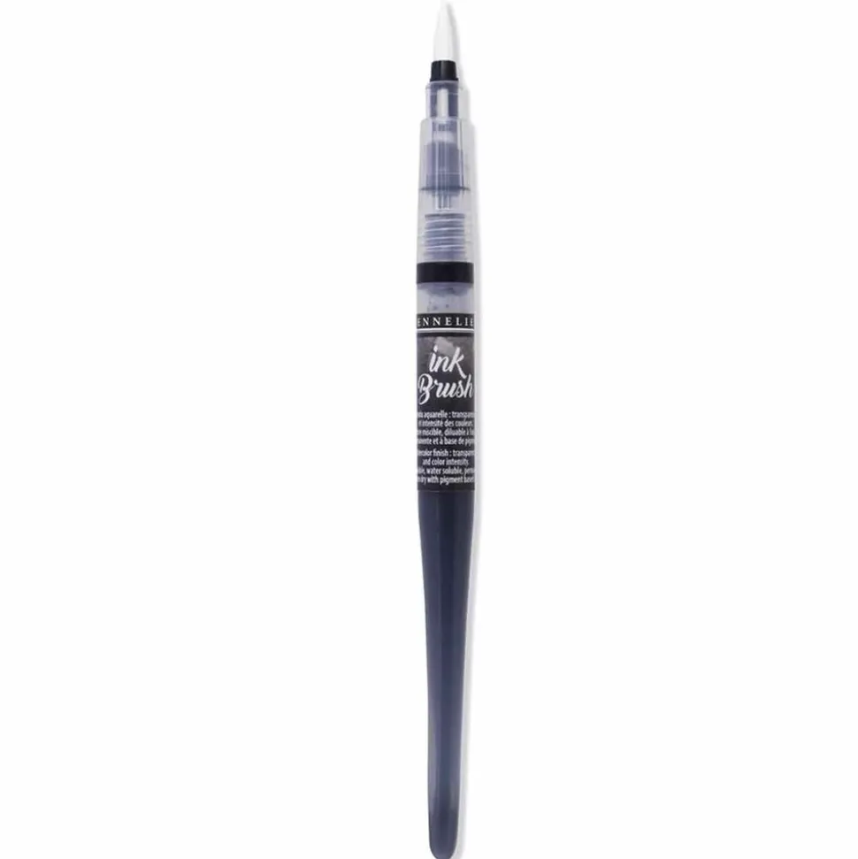 Stylo pinceau avec réservoir à encre prérempli de 6,5 ml offrant une prise en main similaire à un pinceau classique. Grâce à votre utilisation et à la variation de pression de la pointe sur le papier, vous pouvez obtenir différents tracés. Ce pinceau offre une large polyvalence et vous accompagnera dans vos activités de scrapbooking, de carterie, lettrage, bullet journal. Lancée par Sennelier en 2020, Ink Brush est une gamme de 36 pinceaux d’encre diluable à l’eau. Ce pinceau, dessiné par Yves-Marie Salanson, le directeur artistique de la maison Sennelier, est innovant par bien des aspects : des pointes de pinceaux en vraies fibres synthétiques (contrairement aux feutres avec embouts en mousse), rendant l’application de la couleur plus fluide, constante et linéaire, profitant de la capillarité interne du pinceau pour faciliter la dispersion de la couleur. Dans le même geste, l’artiste peut créer des lignes extrêmement fines et très larges (jusqu’à 10 mm) avec un flux continu d’encre, par simple variation de pression de la pointe sur le papier. Par ailleurs, la formule est de base pigmentaire exclusive à Sennelier, respectueuse de l’environnement (ce qui explique qu’il n’y a aucun marquage de sécurité sur l’étiquette). 24 des 36 couleurs appartiennent à la gamme ‘La Petite Aquarelle’ de Sennelier. Les pinceaux encre ‘Ink Brush de Sennelier’ conviendront donc autant aux adeptes du Lettering, aux fans de Bullet Journal, qu’aux aquarellistes. En résumé : pointe pinceau formée de fibre synthétique, encre diluable à l’eau, respectueuse de l’environnement, formule exclusive Sennelier, base pigmentaire 24 couleurs identiques aux couleurs de la gamme ‘la Petite Aquarelle’, et 12 couleurs irisées, pointe précise, flux régulier, design élancé, proche de la forme d’un pinceau. Couleur : noir ivoire