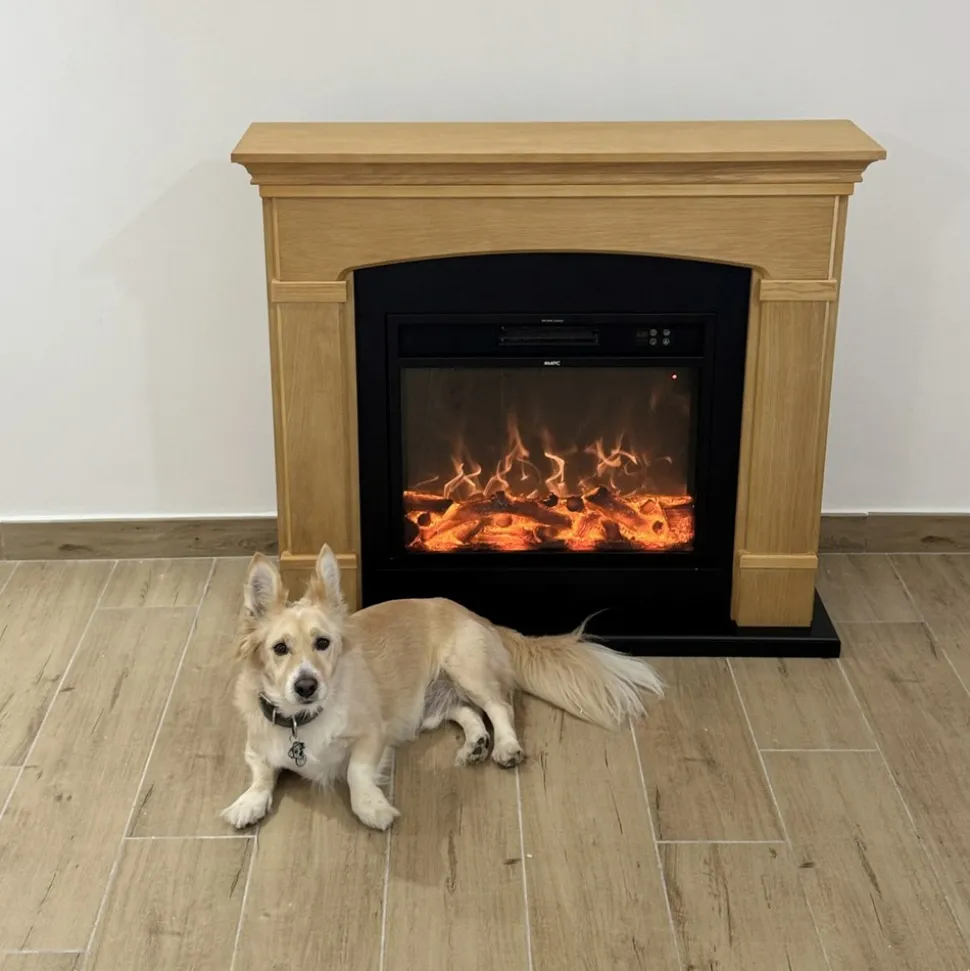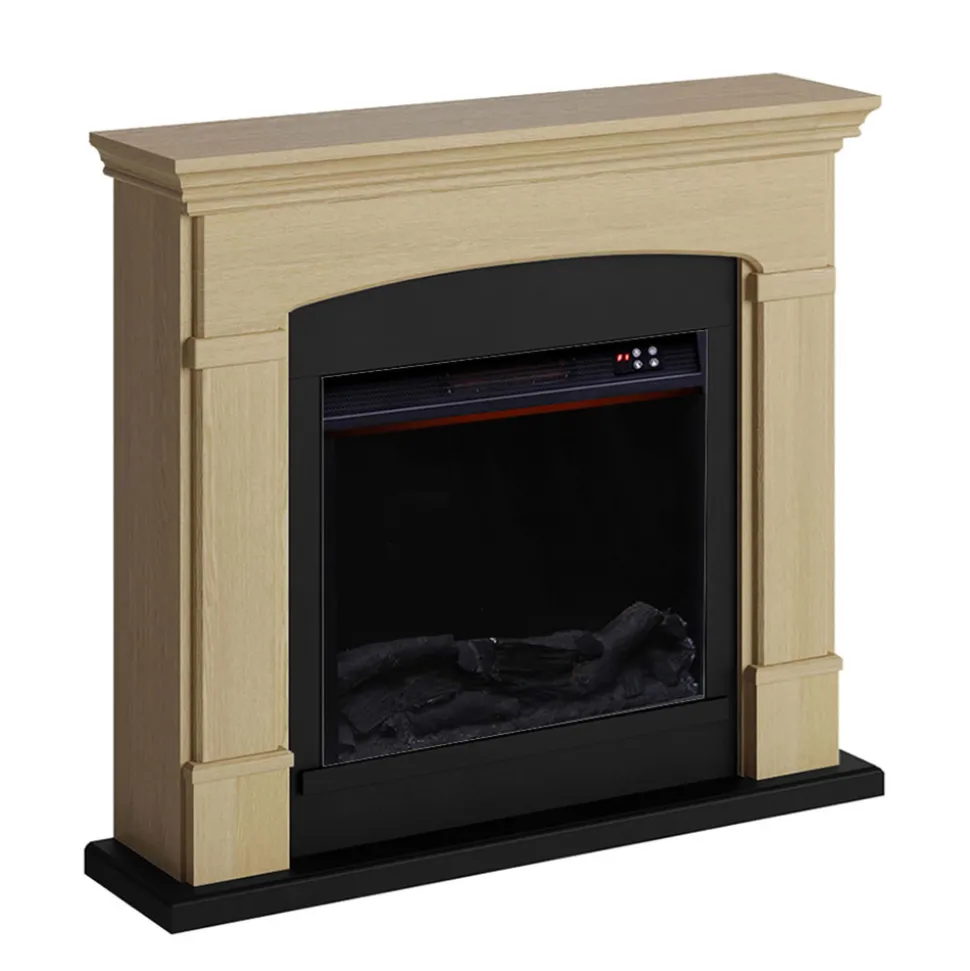 Cheminée au sol dans la nouvelle couleur chêne naturel, design épuré avec des bords arrondis. La cheminée présente une finition en chêne multicouche, ainsi qu’un centre arqué délicat, des colonnes lisses et un cadre central aux bords arrondis. La lumière LED intégrée est très réaliste. Sa profondeur de seulement 25 cm lui permet d’être peu encombrant et de s’adapter à toutes les pièces.