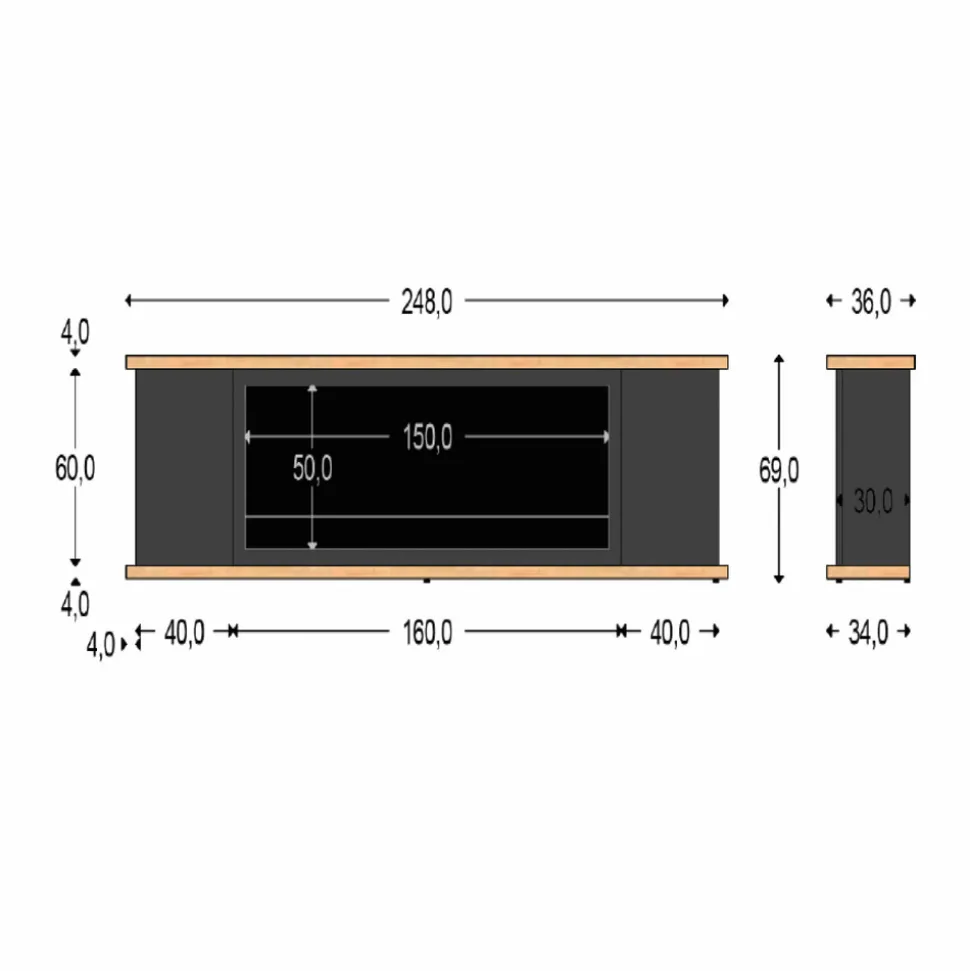 Les dimensions généreuses offrent l’espace que vous recherchez sans être encombrantes. Avec une largeur totale de 248 cm, une hauteur de 69 cm et une profondeur de 36 cm, il est parfait pour tirer le meilleur parti de l’espace, même le plus limité. Les portes latérales de 40 cm de large et de 60 cm de haut offrent un espace de rangement supplémentaire, tandis que la tablette de 1 cm d’épaisseur ajoute de la robustesse sans compromettre l’élégance.