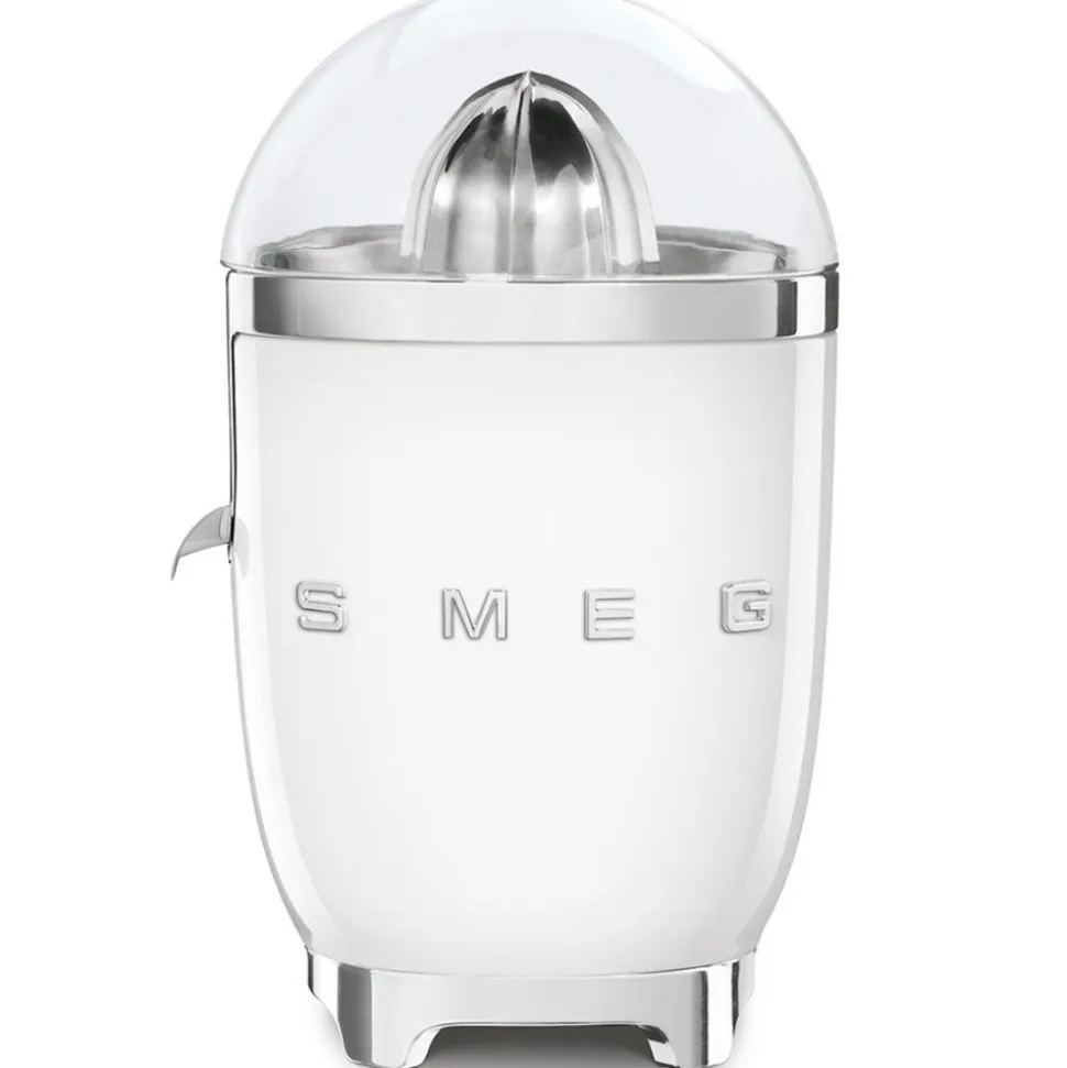 Presse-agrumes Années 50 Smeg CJF11WHEU. La gamme Années 50 se caractérise par un incomparable look rétro et vintage avec une forme bombée et compacte. Pensée pour ceux qui souhaitent vivre une expérience de chef, mais pas seulement… aussi pour ceux qui aiment s’entourer d’objets au fort caractère esthétique sans renoncer à la qualité des résultats. Un presse-agrumes design et efficace ! Cône universel pour un pressage facile de tous les agrumes : citrons, oranges, pamplemousses, etc …