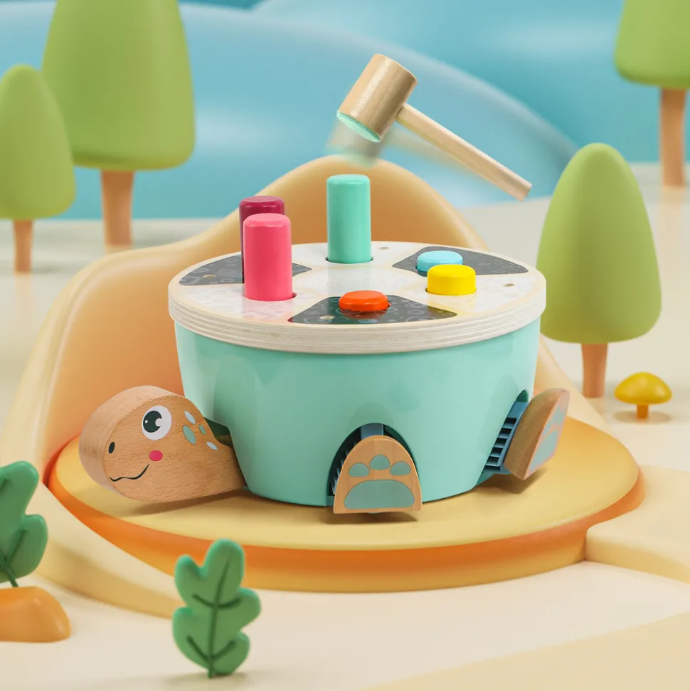 Les enfants peuvent frapper les blocs colorés avec un marteau en bois pour faire sortir les pattes, la tête ou la queue de la carapace de la tortue. Un jeu amusant pour les enfants à partir de 18 mois.