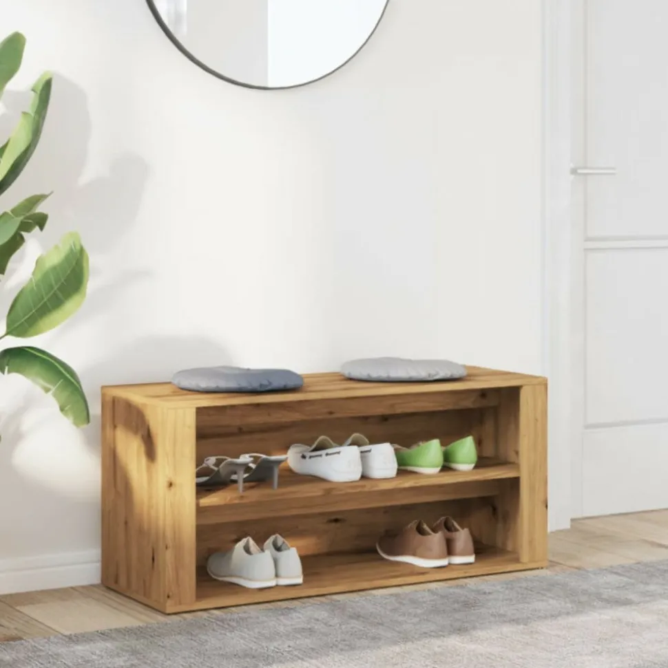 Gardez vos chaussures à l’abri de la poussière et du désordre pour créer un environnement bien rangé grâce à cet élégant banc à chaussures ! Matériau robuste : le bois d’ingénierie est d’une qualité exceptionnelle avec une surface lisse et présente également résistance, stabilité et résistance à l’humidité. Fabriqué en bois d’ingénierie, le meuble à chaussures est facile à nettoyer.Grand espace de rangement : ce banc à chaussures dispose de 2 compartiments, offrant amplement d’espace de rangement pour ranger tous les types de chaussures.Dessus robuste : le dessus robuste du banc de rangement vous permet de vous asseoir confortablement tout en enlevant ou en mettant vos chaussures.Facile à entretenir : le banc de rangement pour chaussures est facile à nettoyer avec un chiffon humide et nécessite moins d’entretien. Couleur : chêne artisanalMatériau : bois d’ingénierieDimensions : 100 x 35 x 45 cm (l x P x H)Assemblage requis : ouiCouleur : chêne artisanalMatériau : bois d’ingénierieDimensions : 100 x 35 x 45 cm (l x P x H)Assemblage requis : oui