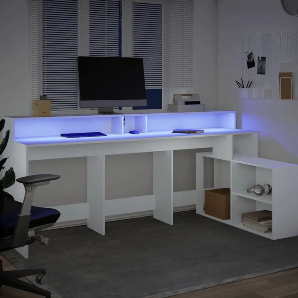 Avec un grand espace de rangement, une construction durable et des options d’éclairage LED, ce bureau est parfait pour créer un espace de travail ou de jeu organisé et élégant. Matériau stable et durable : le bois d’ingénierie est un matériau durable et stable dont la surface lisse résiste à l’humidité, à la déformation et au fendillement, ce qui en fait un choix fiable pour divers projets.Lampes LED RVB pour une ambiance agréable : ce bureau est équipé de lampes LED qui peuvent être facilement réglées pour créer un spectacle lumineux personnalisé. Vous pouvez personnaliser les modes, les couleurs et la luminosité pour améliorer l’ambiance de votre espace intérieur.Grand espace de rangement : le bureau comprend des compartiments et des étagères ouverts, offrant de nombreuses options de rangement pour tous vos articles de bureau et vous aidant à garder votre espace de travail organisé et sans encombrement. De plus, le bureau LED est doté d’un trou spécial pour la gestion des câbles, garantissant que votre bureau reste bien rangé.Entretien facile : grâce à sa surface lisse, le bureau LED est facile à nettoyer avec un chiffon sec et doux et nécessite moins d’entretien. Veuillez débrancher le produit de l’alimentation électrique ou éteindre l’alimentation électrique lorsqu’il n’est pas utilisé et lors du nettoyage. Attention :Pour éviter qu’il ne bascule, ce produit doit être utilisé avec le dispositif de fixation murale fourni. Bon à savoir :Les vis et les chevilles pour l’intérieur du mur ne sont pas incluses. Nous vous conseillons de trouver et d’utiliser des vis et des chevilles adaptées spécifiquement à vos murs. Si vous n’êtes pas sûr, vous pouvez consulter un professionnel. Veuillez lire et suivre chaque étape des instructions.Ce produit est doté d’un connecteur USB qui nécessite une source d’alimentation USB de 5V certifiée (non incluse).