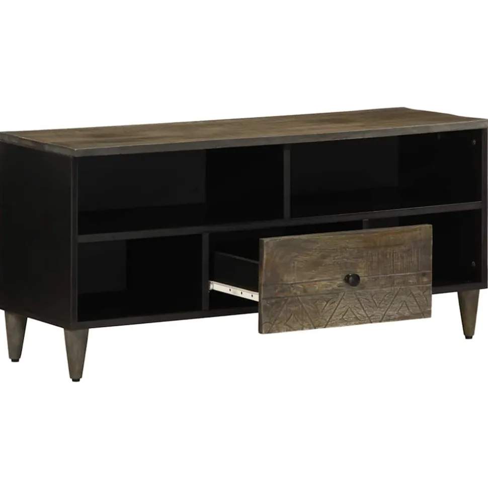 Ce meuble TV en bois avec un grand espace de rangement est un complément pratique et attrayant pour votre salon ou votre chambre à coucher. Matériau robuste et stable : le bois de manguier massif, un bois dur tropical robuste, est très apprécié pour la fabrication de meubles en raison de sa durabilité et de sa solidité exceptionnelles. Ses beaux grains de bois rendent chaque meuble unique et légèrement différent de l’autre.Grand espace de rangement : ce meuble TV offre un grand espace de rangement pour garder vos magazines, livres, DVD et appareils multimédias bien organisés et à portée de main.Motif sculpté à la main : le motif délicatement sculpté donne au meuble TV un aspect unique.Dessus stable et robuste : le dessus robuste est idéal pour placer votre téléviseur et vos systèmes stéréo ou certains objets décoratifs tels que des vases ou des plantes en pot.Facile à entretenir : la console TV est facile à nettoyer à l’aide d’un chiffon humide et nécessite peu d’entretien. Bon à savoir :Chaque article est unique, avec des variations de couleurs et de grains. La livraison est aléatoire, ce qui garantit l’exclusivité et l’individualité de votre produit.