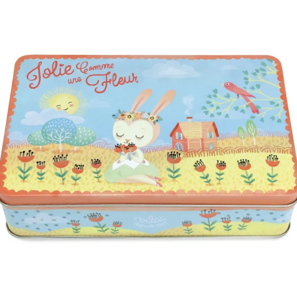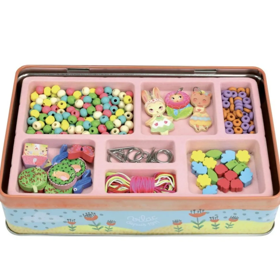 De jolies perles en bois de différentes tailles avec des pendentifs très originaux, dans une boîte en métal sur le thème du jardin, pour faire des colliers et des bracelets. 330 perles et breloques pour créer des bijoux colorés et originaux.