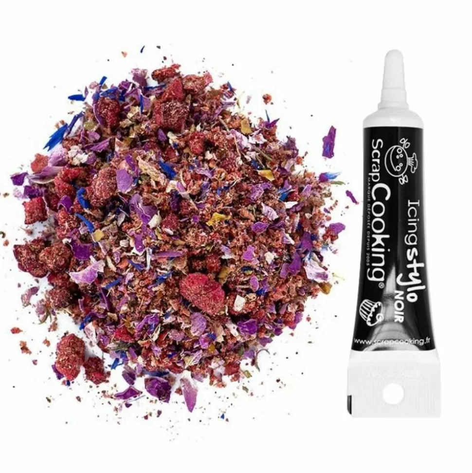 Pour parfumer vos chocolats mais aussi vos pâtisseries, découvrez les Fleurs d’Epices biologiques pour chocolat! De magnifiques couleurs et un accord fruité-épicé qui donnera cette touche d’originalité à votre chocolat. Saupoudrées sur vos desserts au chocolat, incorporées à vos préparations chocolatées, ou en paillettes sur un délicieux chocolat chaud, les Fleurs d’épices chocolat donneront cette touche savoureuse et colorée à vos préparations gourmandes. Conçu pour sublimer le chocolat : les boutons de rose, de fraises et de framboises s’allient à la vanille et aux baies de poivre rose relevées. Ingrédients : morceaux de fraise*, baies de poivre rose*, boutons de rose*, morceaux de framboise*, coriandre*, vanille*, pétales de bleuet*. *Produit issu de l’agriculture biologique. Boîte de 40 grammes. Ingrédients préparation sucrée gélifiée noire : sirop de glucose (45%), saccharose (40%), eau, agent gélifiant : E406, colorant : E153, arôme, acidifiant : E330, conservateur : E202.