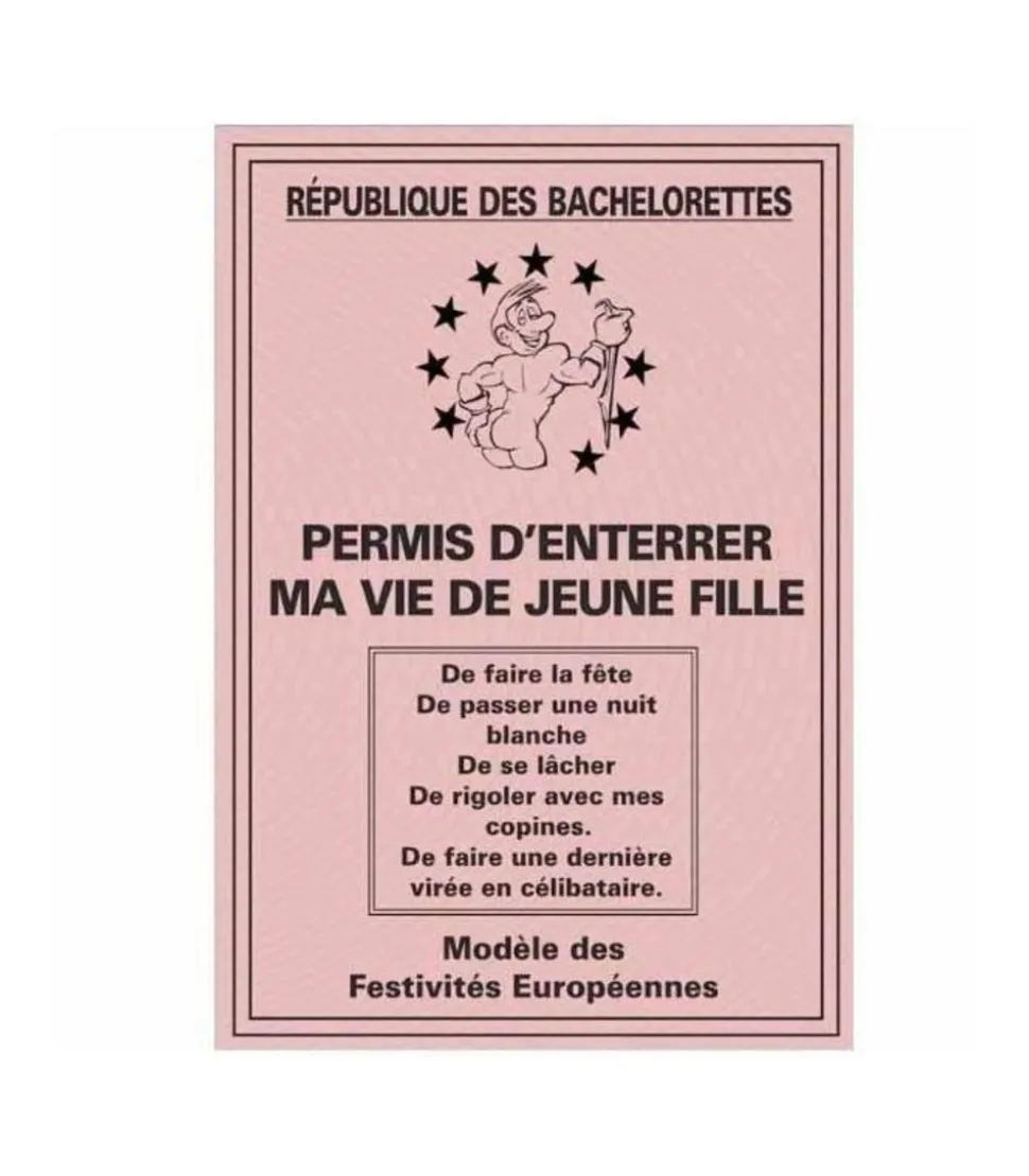 Attention aux futures mariées, ce permis vous informe sur ce dont vous avez le droit de faire pour votre dernière nuit de célibataire. Tout vous est permis, enfin… Presque !!! 3 volets pliables à compléter avec photo. Dimension : 20.5 x 14.5 cm