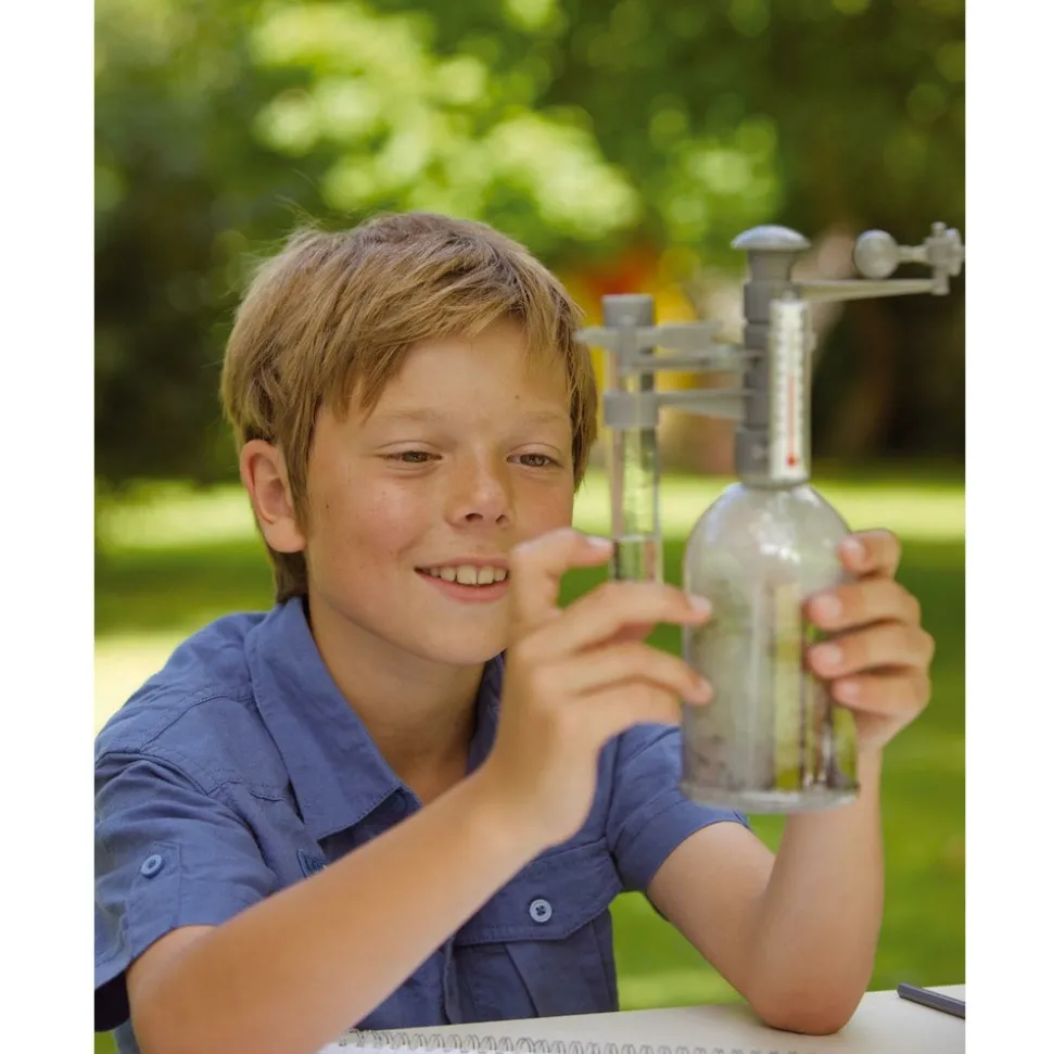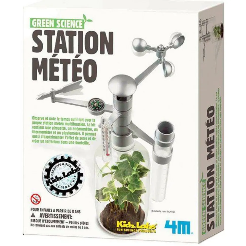 Kit scientifique station météo Observe et note le temps qu’il fait avec ta propre station météo multifonctions. Le kit contient une girouette, un anémomètre, un thermomètre et un pluviomètre. Il permet aussi d’expérimenter l’effet de serre et de réaliser un terrarium dans une bouteille. Pour enfants à partir de 8 ans. Avertissement : risque d’étouffement, petites pièces ; interdit aux enfants de moins de 3 ans. Bouteille non fournie.