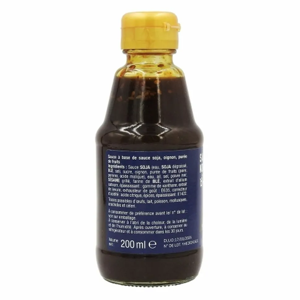 Sauce SOJA (eau, SOJA dégraissé, BLE, sel), sucre, oignon, purées de fruits (poire, pomme, acide malique), eau, ail, sel, poivre noir, SESAME grillé, farine de BLE, extrait d’allium sativum, épaississant : gomme de xanthane, extrait de levure, exhausteur de goût : E635, correcteur d’acidité : acide citrique, épices, épaississant : E1422