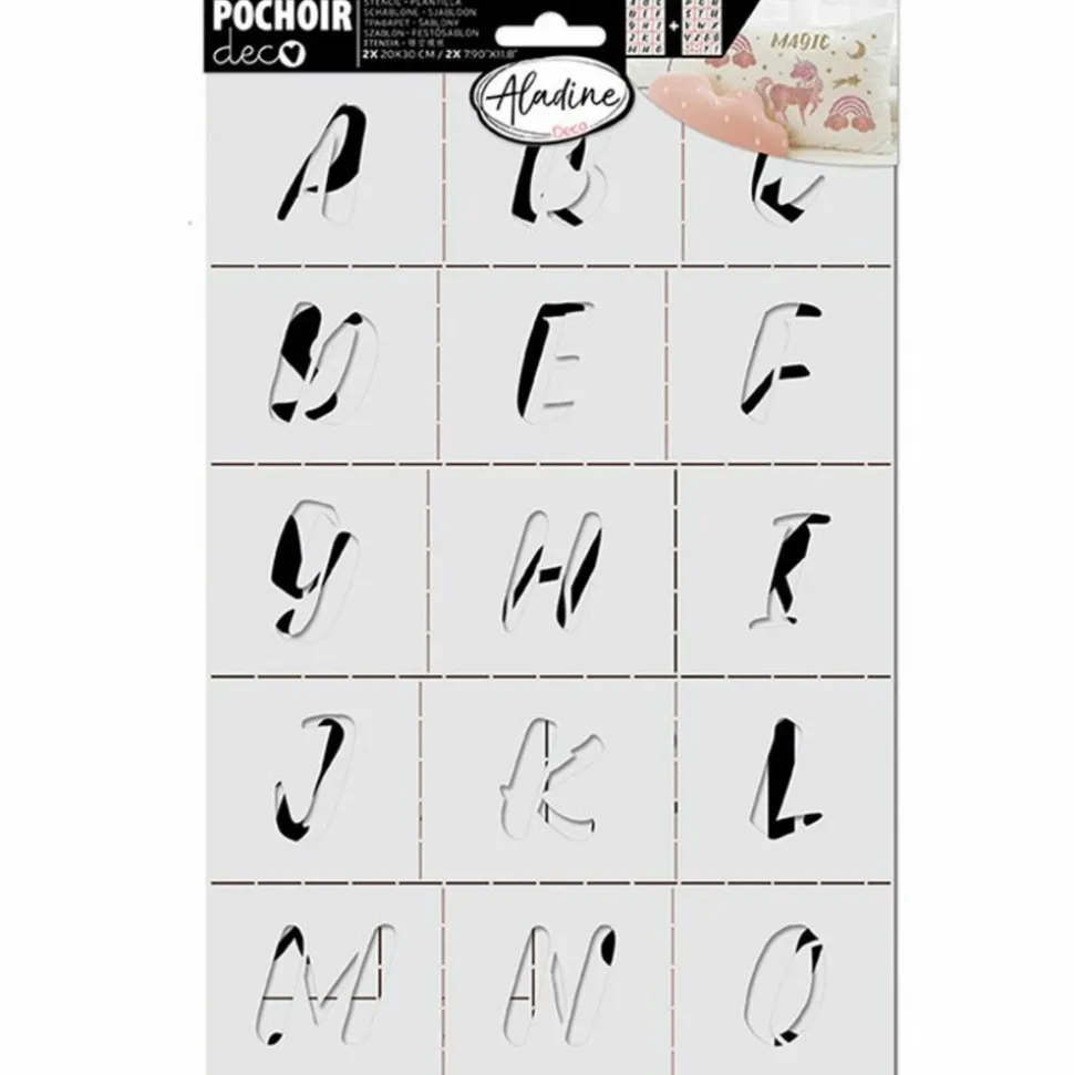Set de 2 pochoirs tout support – Alphabet. Ce pack de pochoirs est idéal pour décorer vos vêtements et accessoires du quotidien : t-shirts, tote-bags, trousse, vase, boîtes, coussins. Utilisez les gammes de peinture Izink pour une belle mise en couleur ! Lavez votre pochoir à l’eau après utilisation. Dimensions : 30 x 20 cm
