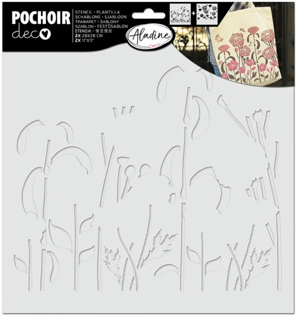 Set de 2 pochoirs superposables tout support – Nature. Ce pack de pochoirs est idéal pour décorer vos vêtements et accessoires du quotidien : t-shirts, tote-bags, trousse, vases, boîtes, coussins. Appliquez une première couche avec le premier pochoir, laissez sécher puis appliquez une seconde couche avec le deuxième pochoir. Utilisez les gammes de peinture Izink pour une belle mise en couleur ! Lavez votre pochoir à l’eau après utilisation. Dimensions : 30 x 30 cm.