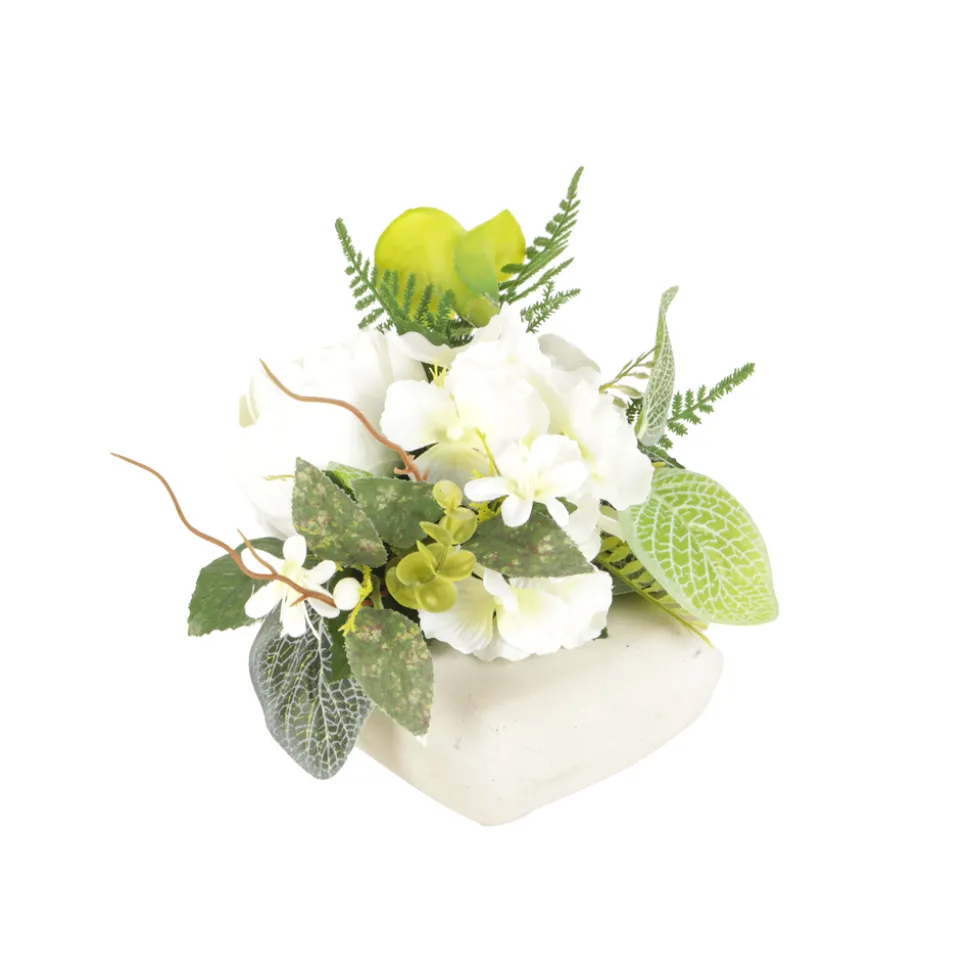 Très en vogue, les fleurs artificielles sont de plus en plus belles et d’un réalisme à s’y méprendre. Composer votre propre bouquet devient ainsi plus facile avec des plantes élégantes et durables. Autrefois, toutes en plastique ; elles sont davantage en textile aujourd’hui (principalement tergal et polyester) : ce qui leur confère une finition irréprochable et un toucher plus agréable, plus doux et moins froid. Quel plaisir de posséder chez soi et tout au long de l’année des plantes exotiques, des fleurs hors saison ou des bouquets plus vrais que nature et ce, quels que soient le climat, la luminosité ou l’absence d’entretien. Et oui, les plantes artificielles sont impérissables ! Ces fleurs artificielles sont disposées dans leur propre pot adapté, ce qui vous permet de les placer à l’endroit de votre choix dans votre intérieur. Composition florale artificielle cœur ciment D.20 H.20cm.
