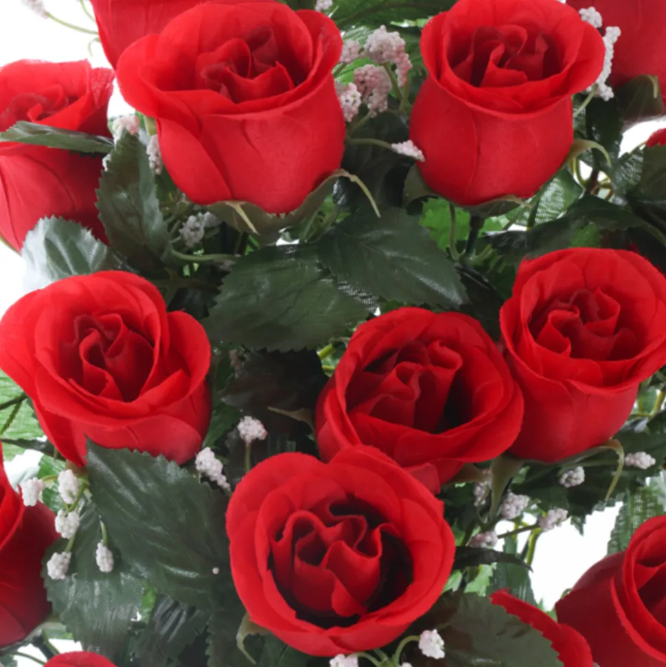 Très en vogue, les bouquets de fleurs artificiels sont de plus en plus beaux et d’un réalisme à s’y méprendre. Autrefois, toutes en plastique ; elles sont davantage en textile aujourd’hui (principalement tergal et polyester) : ce qui leur confère une finition irréprochable et un toucher plus agréable, plus doux et moins froid. Quel plaisir de posséder chez soi et tout au long de l’année des plantes exotiques, des fleurs hors saison ou des bouquets plus vrais que nature et ce, quels que soient le climat, la luminosité ou l’absence d’entretien. Et oui, les plantes artificielles sont impérissables ! Fleurs artificielles – bouquet funéraire rouge avec vase D.28 H.46cm.
