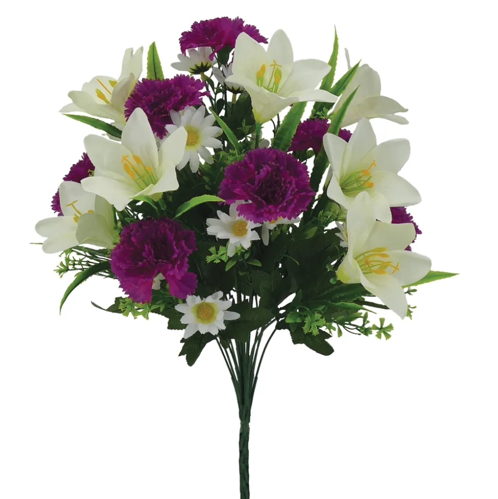Très en vogue, les bouquets de fleurs artificiels sont de plus en plus beaux et d’un réalisme à s’y méprendre. Autrefois, toutes en plastique ; elles sont davantage en textile aujourd’hui (principalement tergal et polyester) : ce qui leur confère une finition irréprochable et un toucher plus agréable, plus doux et moins froid. Quel plaisir de posséder chez soi et tout au long de l’année des plantes exotiques, des fleurs hors saison ou des bouquets plus vrais que nature et ce, quels que soient le climat, la luminosité ou l’absence d’entretien. Et oui, les plantes artificielles sont impérissables ! Fleurs artificielles – bouquet lavande œillets, lys, fleurs H.50cm.