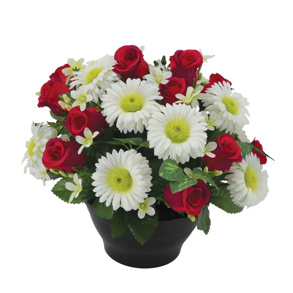 Très en vogue, les compositions florales artificielles sont de plus en plus belles et d’un réalisme à s’y méprendre. Autrefois, toutes en plastique ; elles sont davantage en textile aujourd’hui (principalement tergal et polyester) : ce qui leur confère une finition irréprochable et un toucher plus agréable, plus doux et moins froid. Quel plaisir de posséder chez soi et tout au long de l’année des plantes exotiques, des fleurs hors saison ou des bouquets plus vrais que nature et ce, quels que soient le climat, la luminosité ou l’absence d’entretien. Et oui, les plantes artificielles sont impérissables ! Fleurs artificielles – coupe florale rouge H.29 D.32cm.