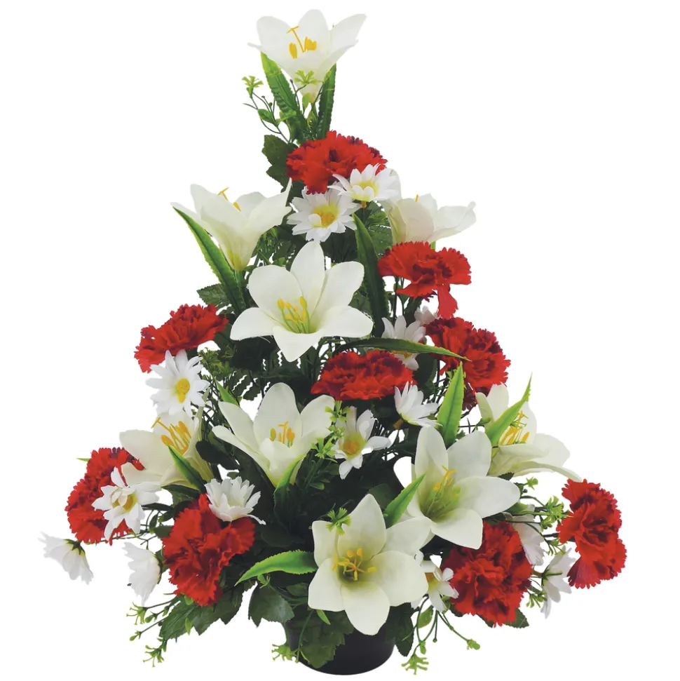 Très en vogue, les compositions florales artificielles sont de plus en plus belles et d’un réalisme à s’y méprendre. Autrefois, toutes en plastique ; elles sont davantage en textile aujourd’hui (principalement tergal et polyester) : ce qui leur confère une finition irréprochable et un toucher plus agréable, plus doux et moins froid. Quel plaisir de posséder chez soi et tout au long de l’année des plantes exotiques, des fleurs hors saison ou des bouquets plus vrais que nature et ce, quels que soient le climat, la luminosité ou l’absence d’entretien. Et oui, les plantes artificielles sont impérissables ! Fleurs artificielles – coupe florale rouge H.48 D.41cm.