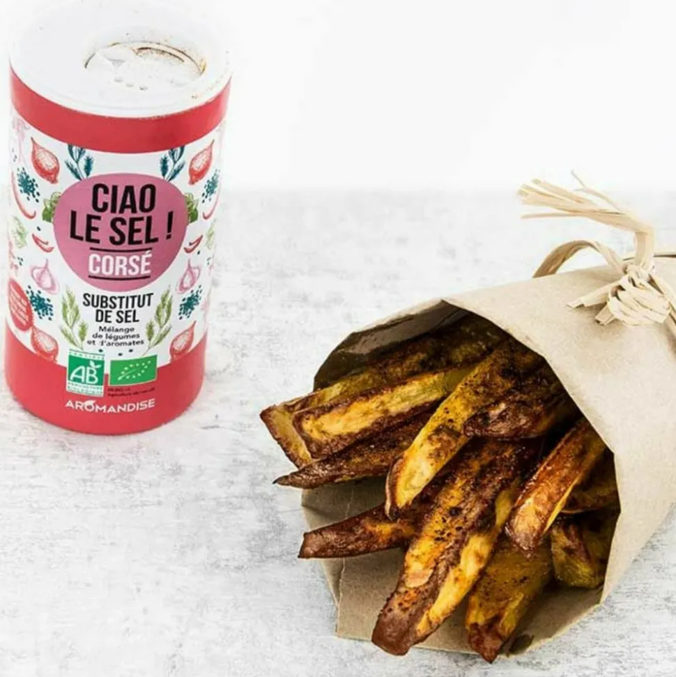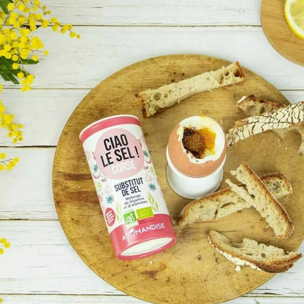 Kit d’épices de la collection Ciao le Sel, par AromandiseCiao le sel est à utiliser comme un condiment de table classique, son format pratique vous permet de l’utiliser à table, sur vos plats, ou dans vos préparations culinaires.Ciao le Sel Doux, c’est un mélange d’épices et de légumes, un savoureux substitut aux notes délicates !70 g net.Ingrédients : persil, carotte, morceaux de panais, graines de citrouille, tomate, morceaux d’oignon, paprika doux, betterave, livèche, curcuma, ail des ours, ail.Ciao le Sel Corsé, c’est un mélange d’épices et de légumes pour un condiment agréablement relevé qui permet de remplacer l’effet hédonique que procure le sel, aux notes légèrement piquantes !70 g net.Ingrédients : tomate, paprika doux, Origan, basilic, oignon, betterave, panais, thym, piment, ail, romarin, graines de citrouille, poivre noir.Ciao le Sel Acidulé, c’est un mélange agréablement acidulé qui permet de remplacer l’effet gustatif du sel !70 g net.Ingrédients : pétales d’hibiscus 35%, graines de moutarde noire, tomates, oignons, algues Wakamé de l’Atlantique 10%.Ciao le Sel Iodé c’est un mélange agréablement iodé.70 g net.Ingrédients : graines de sésame grillées 60%, algues Nori de l’Atlantique 30%, algues Kombu de l’Atlantique 10%.Ces 4 substituts au sel sont issus de l’agriculture biologique.