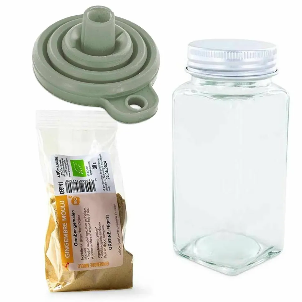 Gingembre moulu bio 30 g avec flacon poudreur et entonnoir. Le paprika moulu biologique est conditionné en sachet dégradable CelloCompost, une protection transparente biosourcée à partir de cellules végétales, dégradable en 90 jours ! Le sachet d’épices comprend une étiquette en papier repositionnable à coller : transvasez les épices dans le flacon poudreur grâce à l’entonnoir, puis collez l’étiquette dessus. Le flacon en verre durable avec bouchon en aluminium comprend une grille recyclable multi-usages. Sa forme carrée permet de gagner de la place dans les placards. Hauteur 10,5 cm, largeur 4,5 cm, contenance 120 ml. L’entonnoir en silicone est lavable facilement. Sa forme évasée permet de verser les épices facilement dans le flacon. En silicone, l’entonnoir est pliable et occupe très peu de place dans les placards. Emballé dans une boîte en carton recyclé. Hauteur 7 cm, diamètre 7,5 cm.