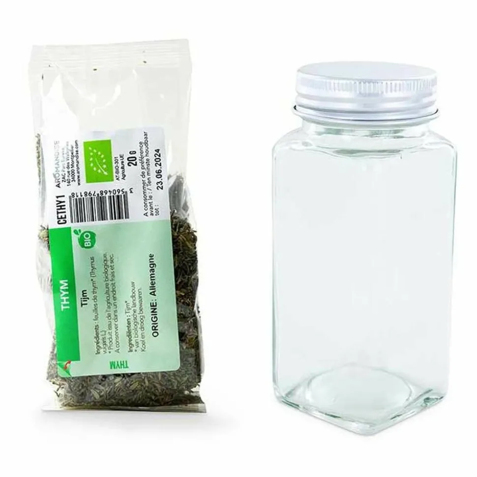 Thym biologique en sachet dégradable 20 g et flacon en verre 120 ml. Le thym est conditionné dans du CelloCompost, une protection transparente biosourcée à partir de cellules végétales, que vous pouvez composter depuis chez vous et biodégrader en 90 jours ! Dans chaque sachet d’épices, vous trouverez une étiquette en papier repositionnable à coller : une fois chez vous, transvasez les épices dans un récipient adapté, puis collez l’étiquette sur votre contenant. Rien de tel pour avoir accès d’un coup d’œil à la date de durabilité minimale et au nom de l’épice. Flacon en verre durable et bouchon en aluminium. Grille recyclable multi-usages pour épices en poudre et aromates en morceaux. Sa forme carrée permet de gagner de la place dans les placards. Hauteur 10,5 cm, largeur 4,5 cm, contenance 120 ml.