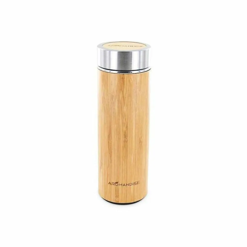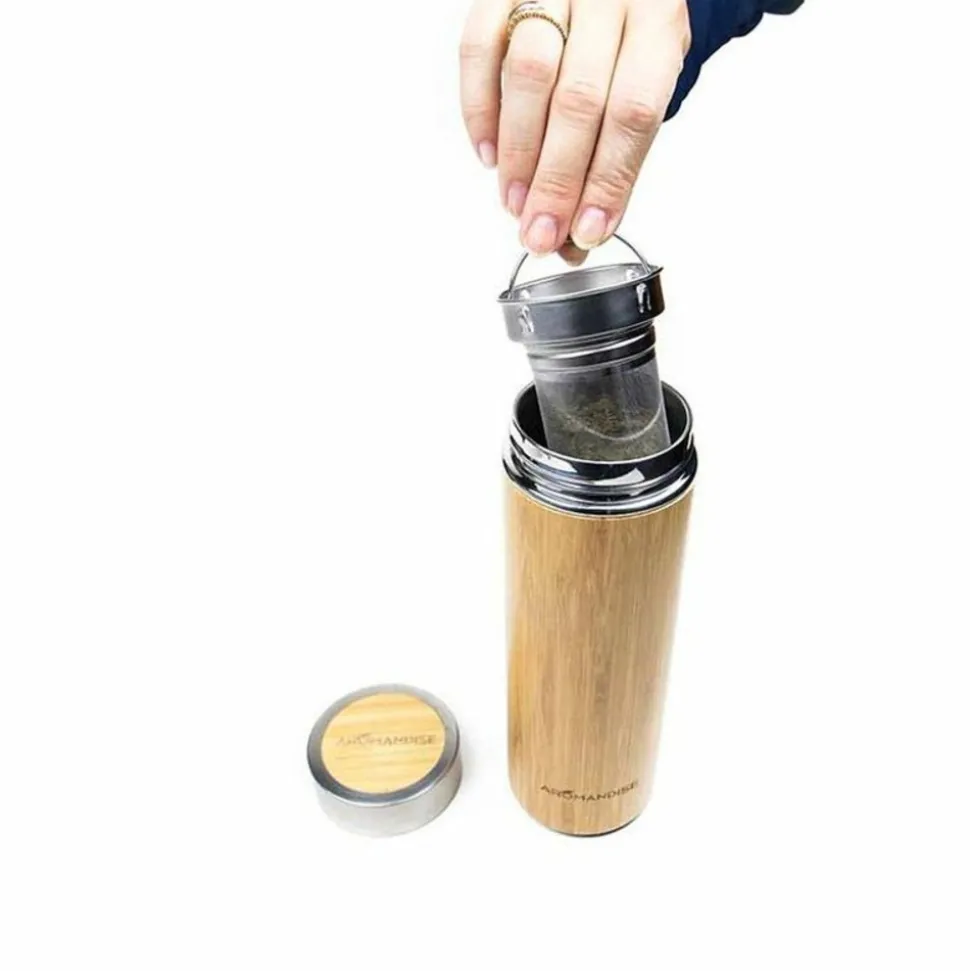 Gourde infuseur en inox et bambou Faites vos infusions où vous le souhaitez, quand vous le souhaitez. Grâce au filtre amovible intégré, vous pourrez voyager en toute sérénité. Ses parois en acier inoxydable garantissent une bonne isolation, mais aussi une bonne résistance. Elle pourra donc vous accompagner plusieurs années. La chaleur de votre boisson peut être conservée durant 5 heures. A nettoyer au premier usage puis après chaque usage : frottez la gourde avec un détergent doux et une éponge non abrasive, rincer à l’eau puis séchez à l’aide d’un torchon. Manipuler avec précaution en évitant les chocs et le micro-ondes : ceci n’est pas un moyen de cuisson. Tenir hors de portée des enfants