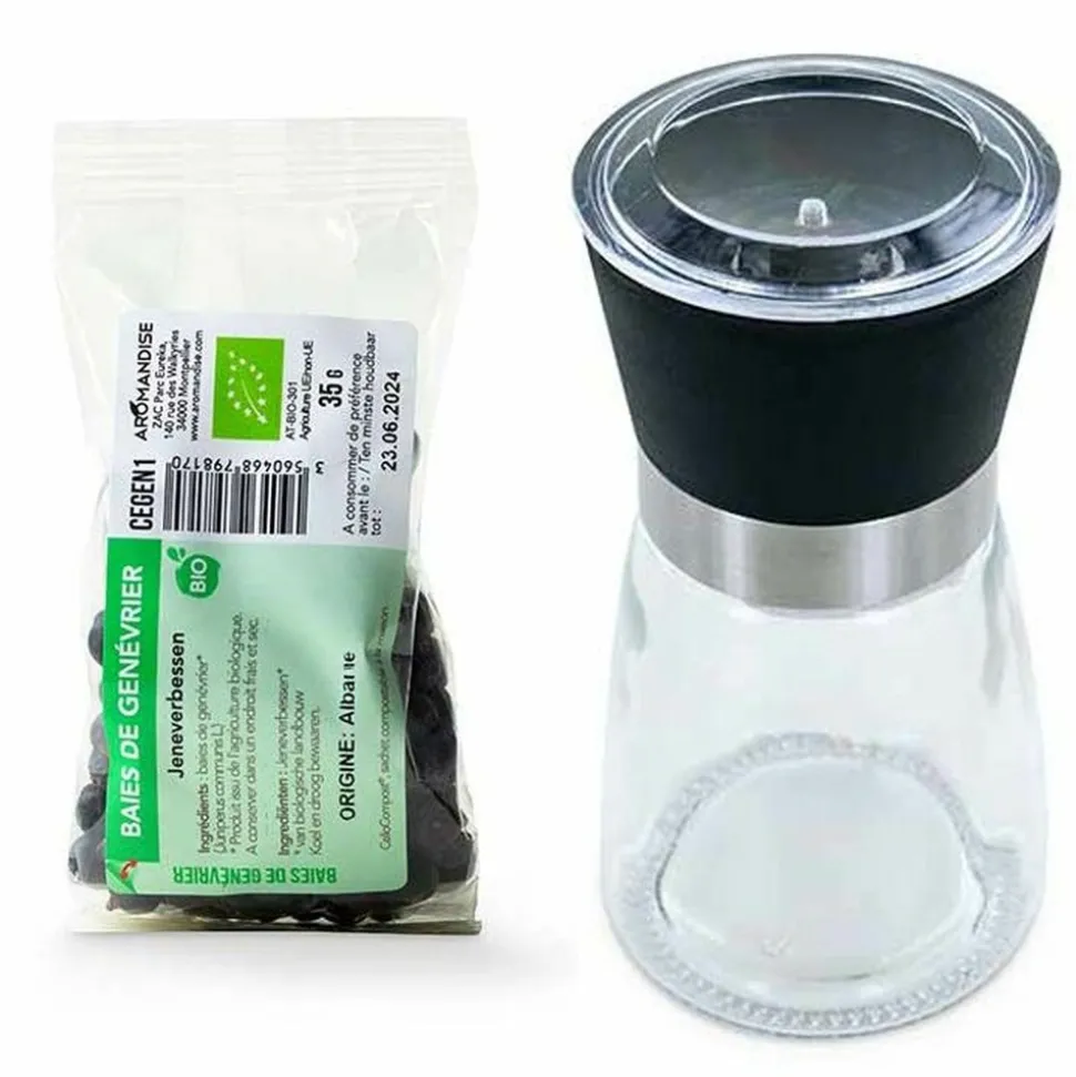 Moulin à épices et baies de genevrier bio. Cet élégant moulin à épices est maniable et facile à nettoyer à la main. Il est conçu en verre avec un mécanisme en céramique réglable en fonction du broyage souhaité. Hauteur 13 cm. Diamètre : 6 cm. Contenance 140 ml. Le sachet de baies de genevrier bio est conditionné en sachet dégradable 35 g. Cette protection transparente biosourcée à partir de cellules végétales permet de préserver au mieux l’arôme du genevrier, puis d’être compostée, pour une biodégradation en 90 jours seulement. Le sachet comprend une étiquette en papier repositionnable à coller sur le flacon : une fois chez vous, transvasez les épices dans un récipient adapté, puis collez l’étiquette dessus.