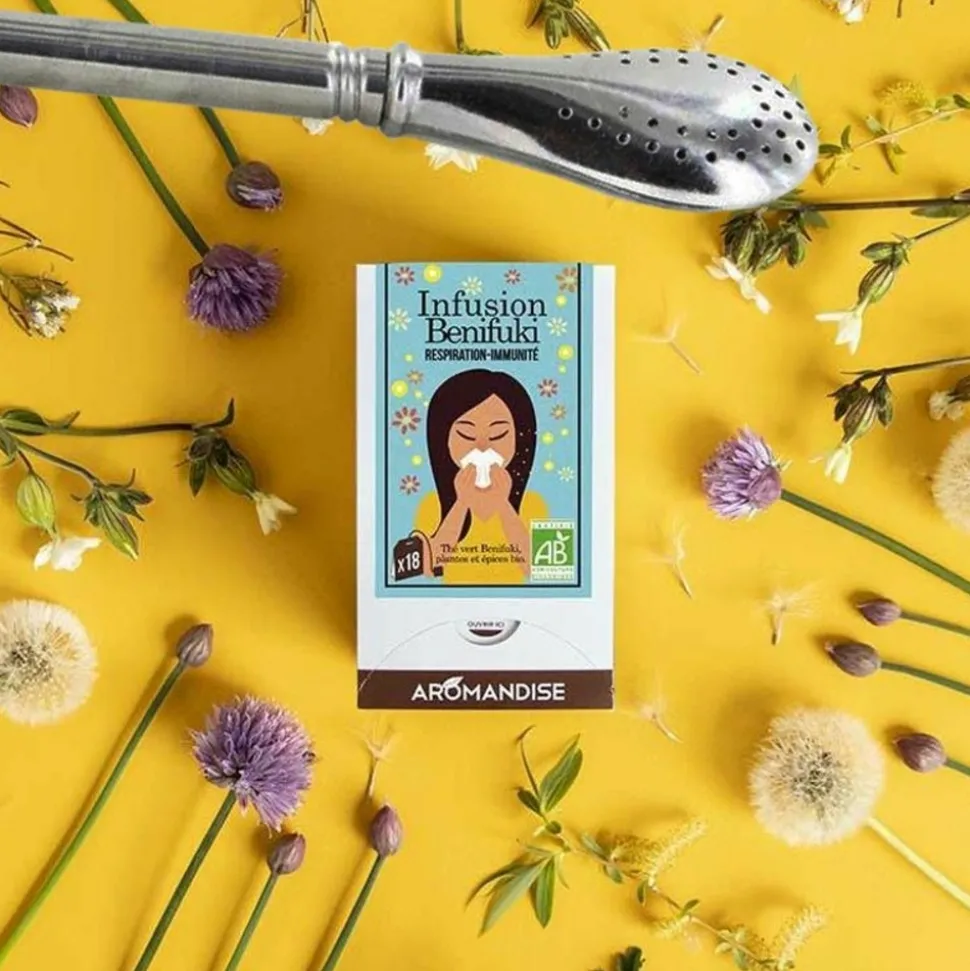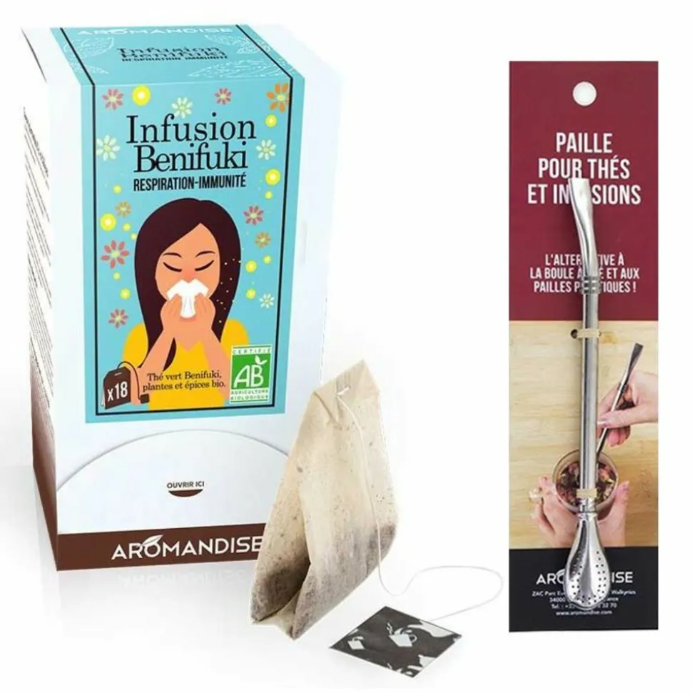 Découvrez l’exceptionnelle tisane Benifuki respiration et immunité ! La tisane Benifuki contient du thé vert Benifuki (Camellia Sinensis L. cv Benifuki), qui contribue au bien-être, à la détente et au renforcement du corps, et dont l’efficacité a été accentuée par le gingembre qui a des propriétés antioxydantes et aide à soutenir l’immunité, l’ortie qui contribue aux défenses de l’organisme et la cannelle qui soutient la santé des voies respiratoires supérieures. La tisane ne peut remplacer une alimentation variée, équilibrée et un mode de vie sain. A envisager dans le cadre d’un programme de 4 à 12 semaines, dont 4 avant la saison des pollens, à raison de 2 sachets par jour, pour un maximum de bienfaits. Contenance : 18 sachets. Thé vert Benifuki* (Camellia sinensis Benifuki) 40%, ortie* 40%, gingembre* 12%, cannelle* 5%, cristaux d’huiles essentielles menthe poivrée* (poudre d’agave tequilana*, huile essentielle de menthe poivrée*). La paille en inox, véritable alternative à la boule à thé, est facile à nettoyer, et convient à toutes sortes d’infusions : thés, tisanes, fleurs, froides ou chaudes. Dimensions : 15 cm.