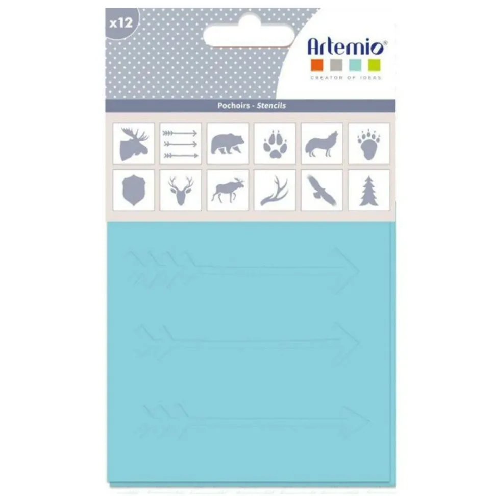 12 Pochoirs en plastique.Ces pochoirs de la collection Woodland mesurent 9 x 9 cm.Ils représentent des motifs ou des animaux de la forêt, tels que : sapin, ours, loup, caribou, empreintes, flèches.Ils permettent de réaliser des décors en peinture, des feutres, sprays de peinture, stylo, craie, sur des objets en bois, carnets, parois.Pensez à nettoyer les pochoirs après usage avec de l’eau et du savon.Mode d’emploi : positionnez le pochoir sur votre support.Appliquez la peinture ou l’encre à l’aide d’un pinceau.Ôtez le pochoir et laissez sécher.Nettoyez le pochoir après utilisation.