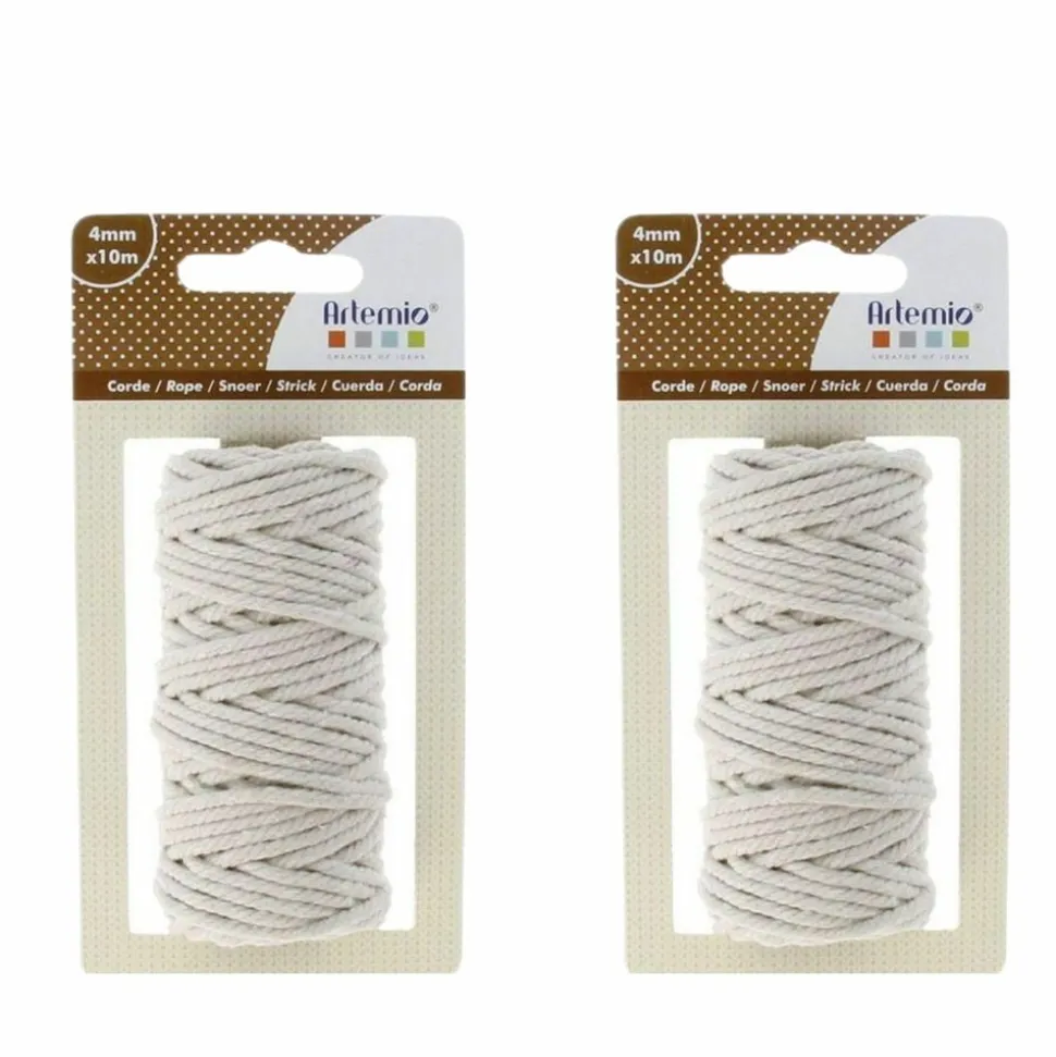 2 cordelettes en coton. Cette cordelette naturelle est constituée de fibres régulières. Elle pourra servir à réaliser un macramé, des emballages de cadeaux, à suspendre des étiquettes ou une guirlande. Longueur 10 m, épaisseur 4 mm.