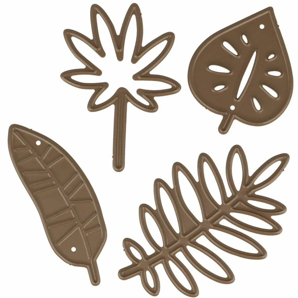 Matrices de découpe en forme de petites feuilles tropicales. Le lot contient 4 feuilles différentes et de différentes tailles. Ces matrices vous serviront pour vos découpes pour réaliser tous vos projets scrapbooking. Il s’agit de découper des formes de papier du même format que la matrice de découpe. Ces matrices sont compatibles avec toutes les machines de découpe au format mini et A5. Dimensions de la feuille n°1 : 4.7 x 3.3 cm. Dimensions de la feuille n°2 : 3.7 x 2.9 cm. Dimensions de la feuille n°3 : 4.7 x 2.3 cm . Dimensions de la feuille n°4 : 4.4 x 4.5 cm.