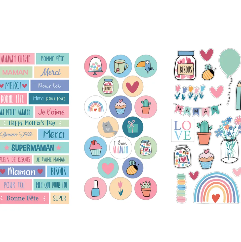 Les fêtes de votre Papa et de votre Maman sont des occasions importantes pour leur dire à quel point vous les aimez. Personnaliser le petit cadeau que vous leur réservez est sans aucun doute une attention délicate qui ne manquera pas de les toucher. Ce set de décoration contient 3 feuilles de stickers autocollants sur le thème de la fête des mères pour que chaque enfant prépare pour sa maman à lui la plus touchante des attentions en cette journée importante. Stickers de décoration Maman pour la fête des mères x3 feuilles.