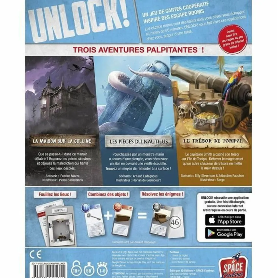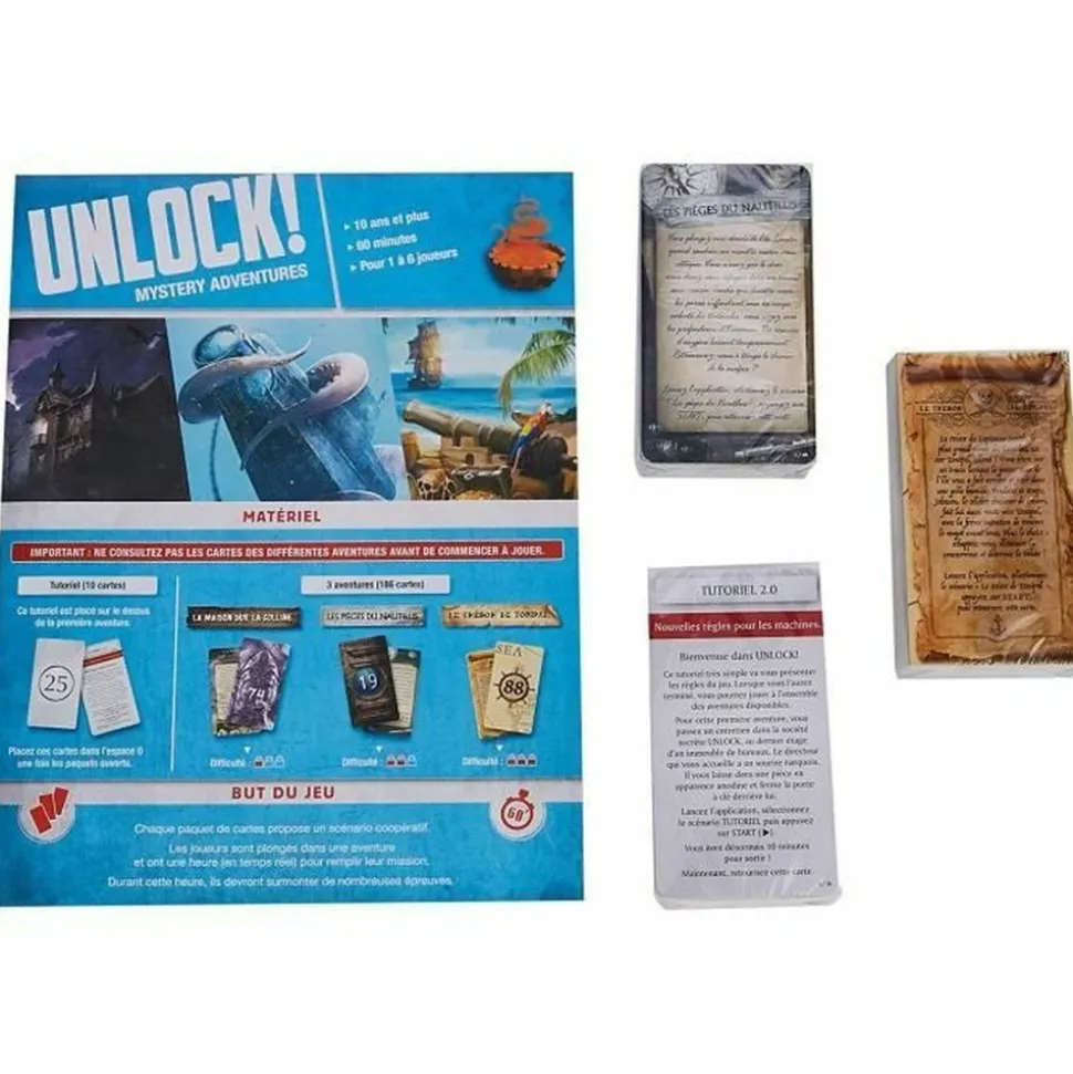 UNLOCK! Mystery Adventures. Jeu de société. Escape Game. A partir de 10 ans Unlock ! est un jeu de cartes coopératif inspiré des escape rooms. Les escape rooms sont des salles dont vous devez vous échapper en moins de 60 minutes. Unlock ! vous fait vivre ces expériences chez vous, autour d’une table. Apres avoir pris connaissance du contexte du scénario, vous commencez votre aventure dans une piece.