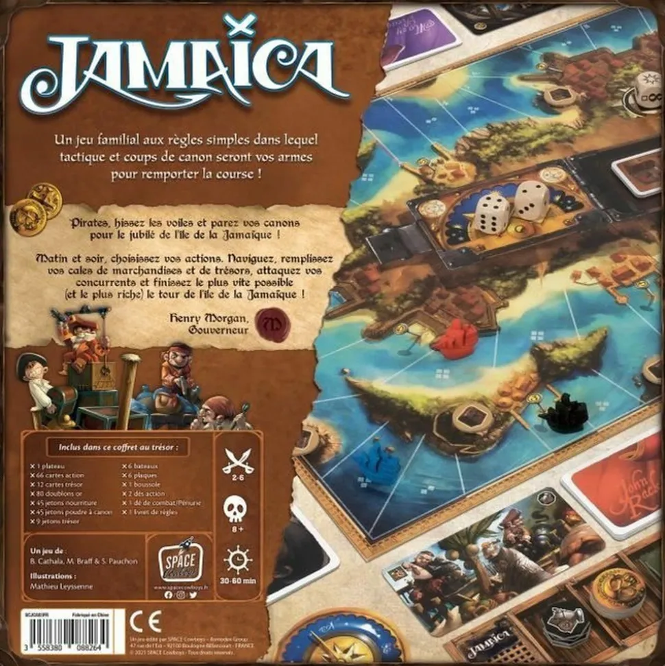 Participez a une course de bateaux pirates autour de l’île de la Jamaique dans ce jeu de plateau familial et amusant. Volez les cargaisons des autres joueurs et alliez vitesse et stratégie pour gagner. Le jeu contient 1 plateau de jeu, 6 bateaux pirates, 66 cartes action, 12 cartes de Trésor, 1 pion de premier joueur, 3 dés, 179 pions et 1 livret de regles.