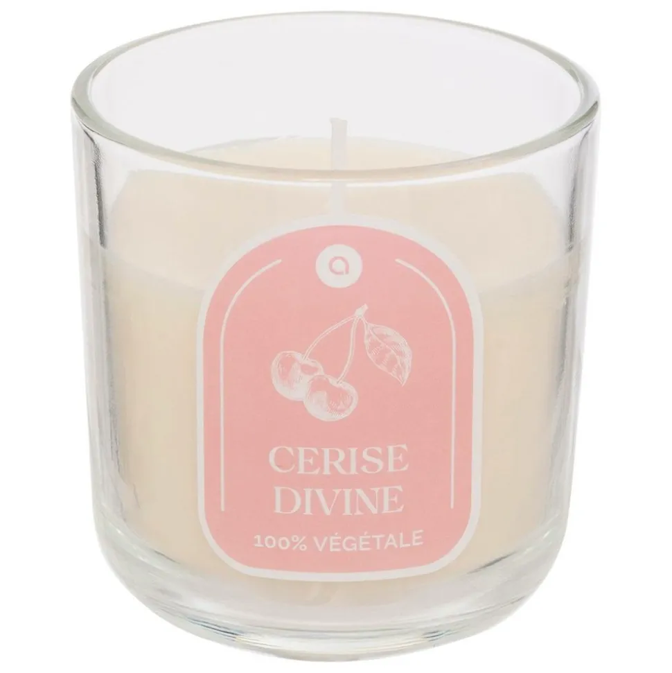 Laissez-vous séduire par la bougie parfumée* » Floa » Atmosphera et profitez d’un parfum à la cerise dans votre intérieur ! Placés dans un photophore cylindrique en verre, ses 115 g de paraffine vous offriront jusqu’à 25 heures d’ambiance olfactive grâce à sa mèche en coton. Vous pourrez recycler le contenant une fois la bougie consumée en y plaçant une bougie chauffe-plat.