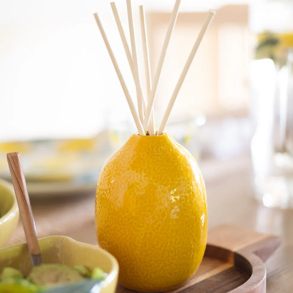 Exotique et coloré, le diffuseur de parfum « Yucatan » Atmosphera séduira les amateurs de senteurs fruitées ! En forme de citron, le contenant en céramique offre un relief très réaliste et il est équipé de 6 bâtonnets en rotin qui diffuseront de l’huile parfumée au citron pendant 9 semaines. Associez ce diffuseur de parfum à une bougie Atmosphera de la même ligne pour créer une ambiance olfactive harmonieuse. Veillez à retourner régulièrement les bâtonnets afin de prolonger la durée de vie de votre huile parfumée.