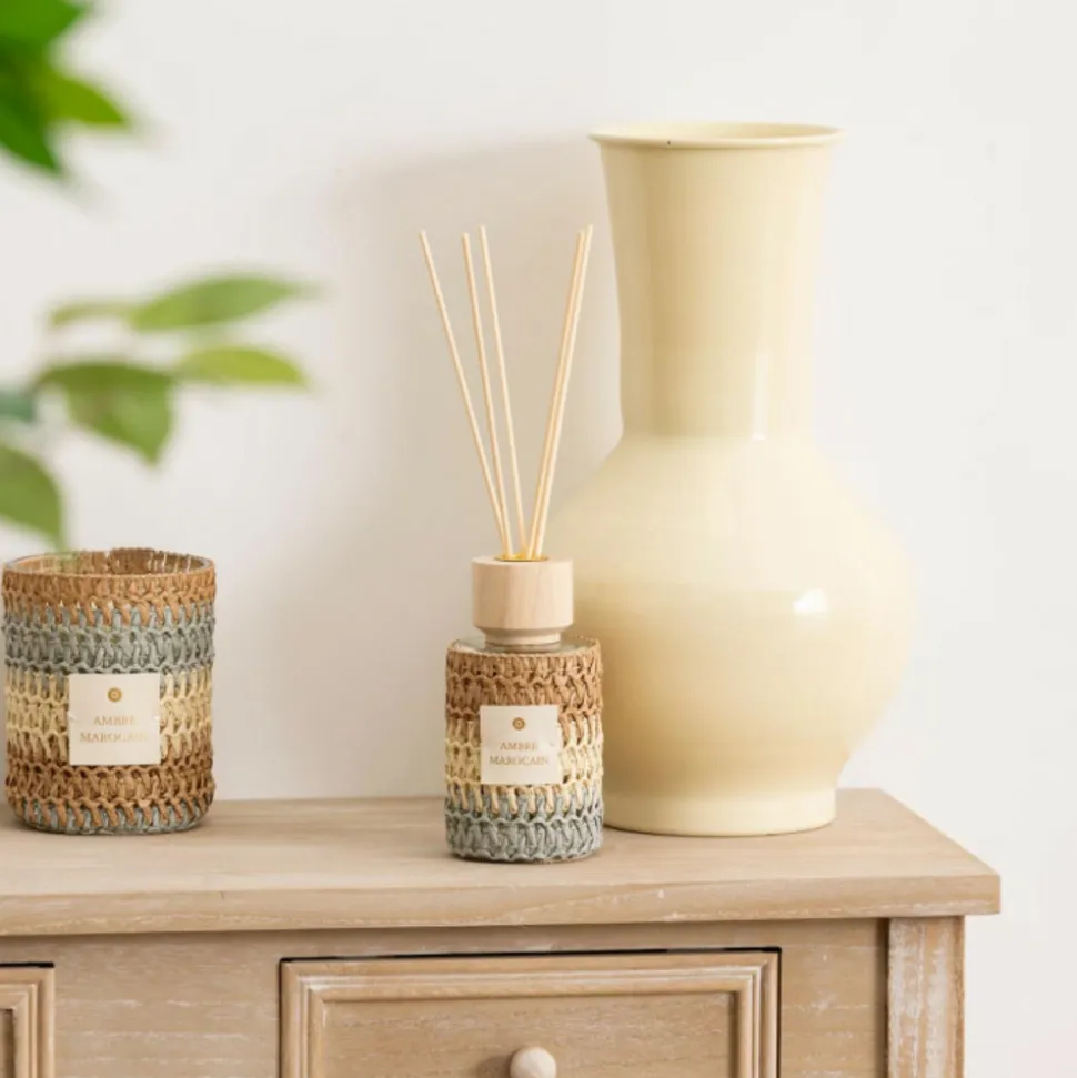 Le diffuseur de parfum « Zaya » Atmosphera se distingue par son flacon en verre entouré d’un tressage de maille colorée et surmonté d’un bouchon effet bois. Il est équipé de 8 bâtonnets qui diffuseront une huile au parfum ambré dans votre intérieur pendant environ 8 semaines. Installez votre diffuseur sur une console ou une étagère en bois dans la pièce de votre choix et complétez avec une bougie de la même ligne pour harmoniser.