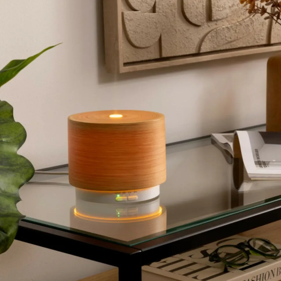 Idéal pour profiter des bienfaits des huiles essentielles en intérieur, le diffuseur d’huiles essentielles « Elsy » Atmosphera conviendra pour brumiser une surface d’environ 25 m2. Esthétique et peu encombrant, il dispose d’un réservoir de 100 ml fermé par un couvercle en résine effet bois très élégant. Ce diffuseur propose deux programmes de pulvérisation ainsi qu’une fonction de contrôle de la durée. Et, pour une détente optimale, il vous procurera, en option, une lumière d’un blanc chaud.