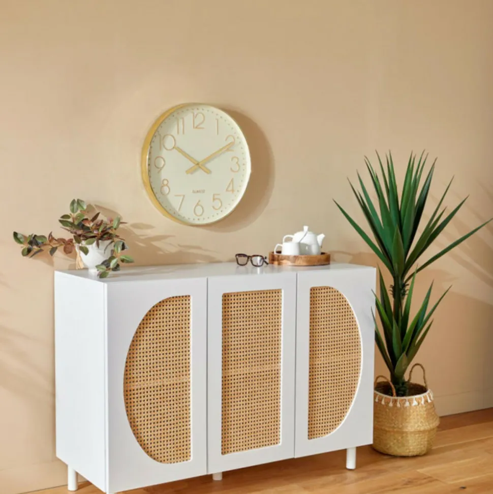 Parfaite pour les petits espaces, l’horloge « Laure » Atmosphera allie simplicité et praticité. Silencieuse grâce à un système ABS, elle est équipée d’aiguilles et de chiffres en laiton qui contrastent élégamment avec le fond clair couleur lin. Cerclée de métal et protégée par une vitre en verre, elle se fondra volontiers dans un univers déco aux accents bohèmes.