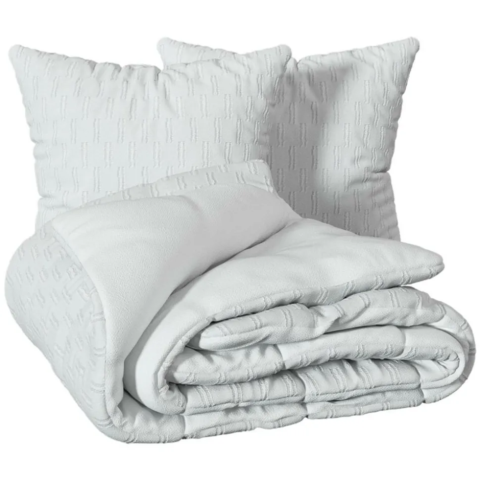 La parure de lit 3 pièces « Edie » Atmosphera est réalisée dans un tissu jacquard blanc sur l’endroit et elle est doublée de tissu microfibre sur l’envers. Chaude et confortable, la housse de couette est équipée d’une fermeture à boutons et elle conviendra pour une couette deux personnes en 260×240 cm. Coordonnée à deux taies d’oreillers carrées de taille standard, elle vous procurera une douceur douillette !