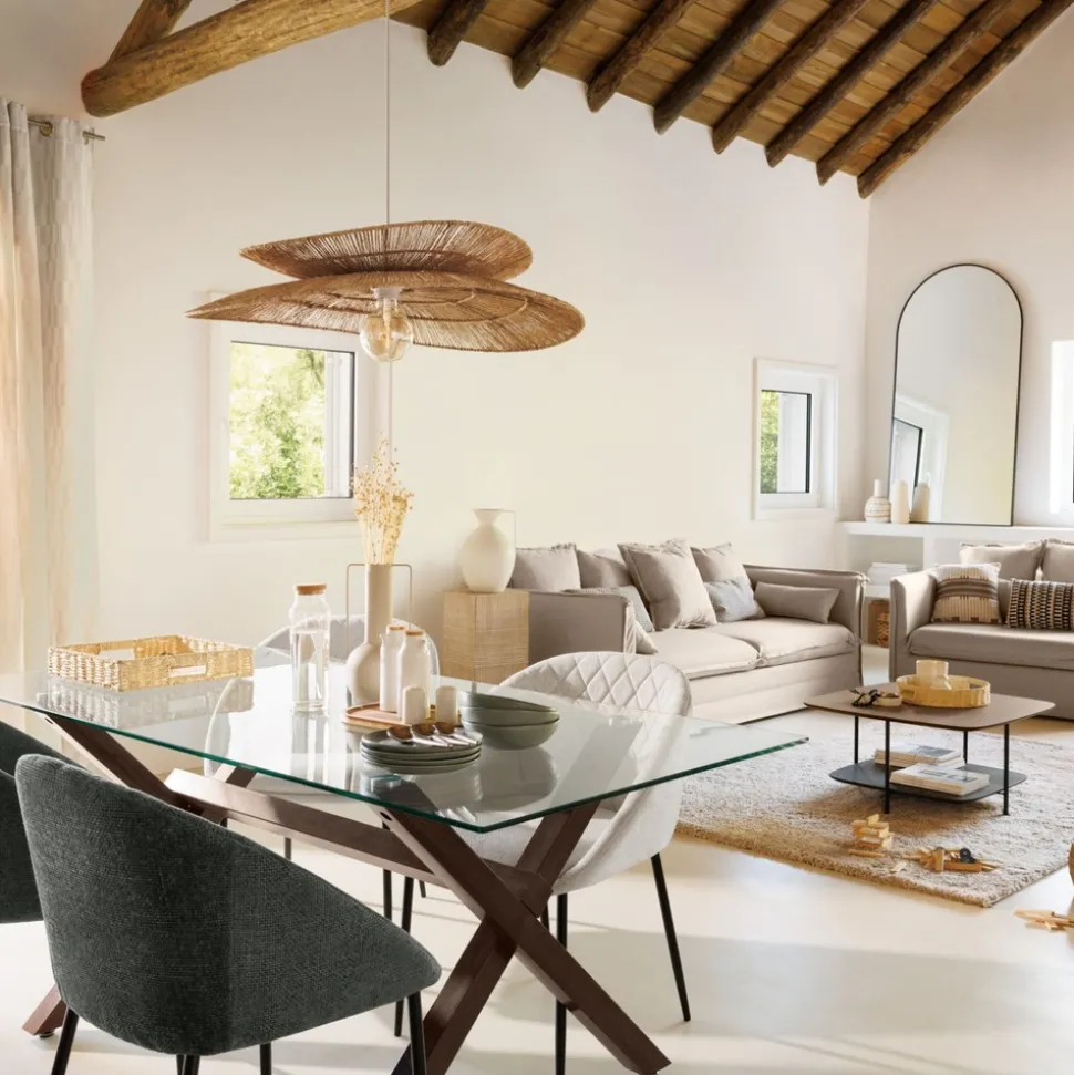 Esthétique et dans l’air du temps, la suspension « Alara » Atmosphera séduira les adeptes de matières naturelles. Dotée d’une double canopée en jute tressée, elle vous procurera une lumière chaleureuse en l’équipant d’une ampoule d’un blanc chaud. Ajustable en hauteur et d’un diamètre généreux, elle vous permettra d’éclairer une grande table à manger en bois comme un coin salon. Complétez votre déco avec des accessoires en raphia ou en jacinthe d’eau pour créer une ambiance propice à l’évasion !