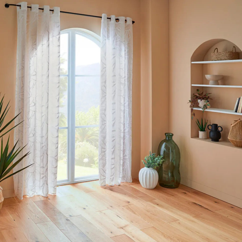 Délicat et tout en transparence, le voilage motif abstrait « Lazi » Atmosphera est idéal pour habiller une fenêtre et apporter de l’intimité dans une pièce sans l’obscurcir. Réalisé dans un tissage léger à motifs feuilles, ce voilage à effet dentelle est équipé d’oeillets métalliques permettant de le fixer très facilement sur une tringle. Proposé en blanc, il se mariera parfaitement avec du mobilier en bois pour former un ensemble convivial.