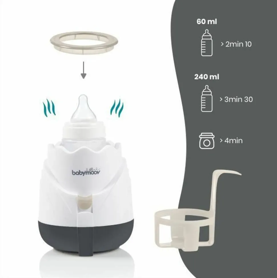 Chauffe biberon. Anneau d’adaptation (pour biberons et petits pots) – Grille d’isolation sur la plaque de chauffe pour réchauffer tous les matériaux de biberons, y compris le silicone – Dosette graduée incluse – Arret automatique, alarme visuelle – 3 min 30 pour un biberon.