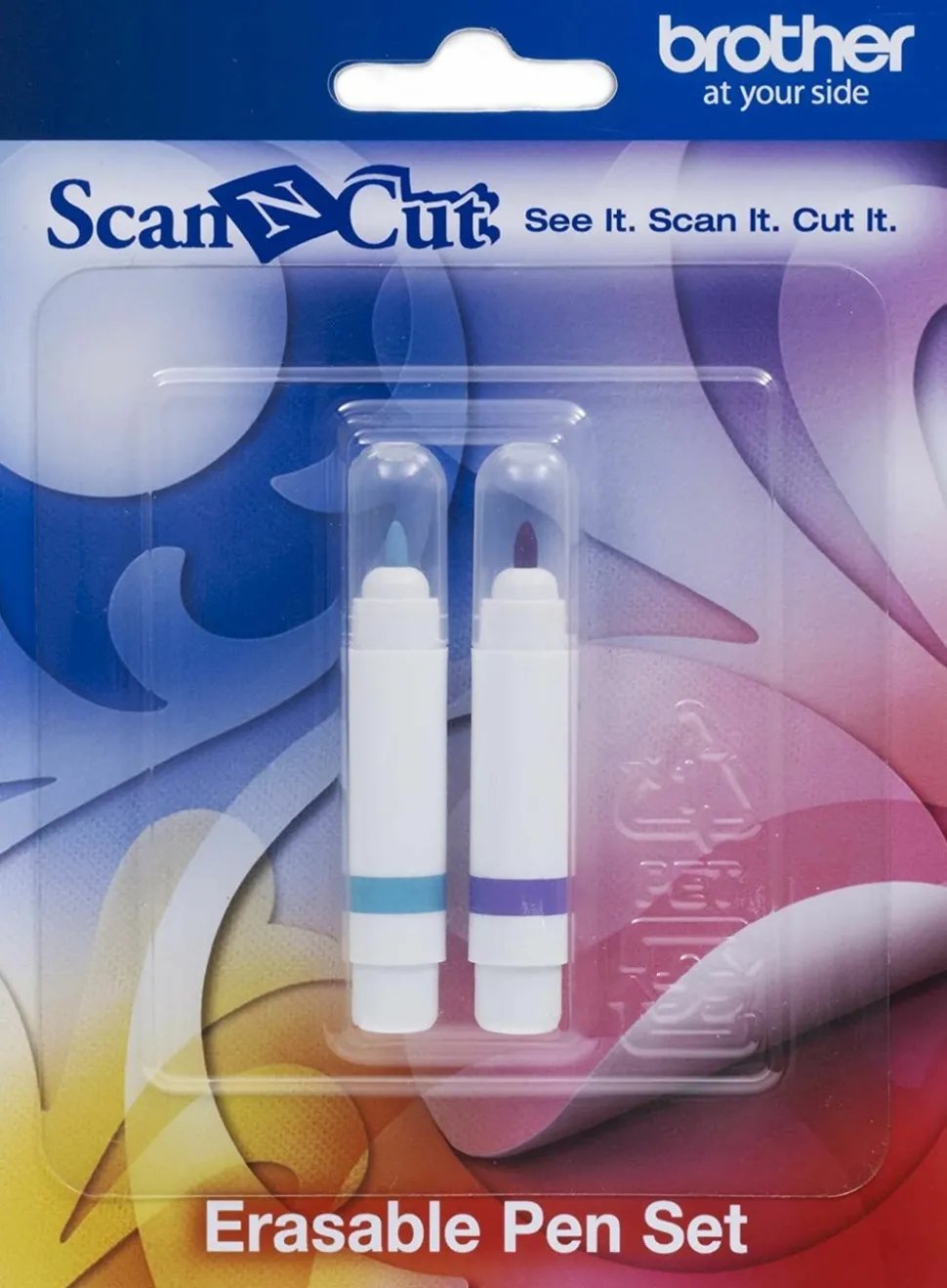 Stylos encre effaçable Ces deux stylos à encre effacable vous permettent d’écrire sur votre création en tissu. Pour marquer vos valeurs de couture, le stylo bleu est effaçable à l’eau. L’encre du stylo violet s’efface dans un délai d’environ 1 semaine. Pour utiliser les stylos Scan N Cut, il faut les mettre dans le porte-stylo ScanNCut (non fourni). Le kit convient pour tous les modèles de machines : ScanNCut cm300, ScanNCut cm600, ScanNCut cm750, ScanNCut cm900, ScanNCut SDX900, ScanNCut SDX1000, ScanNCut SDX1200.