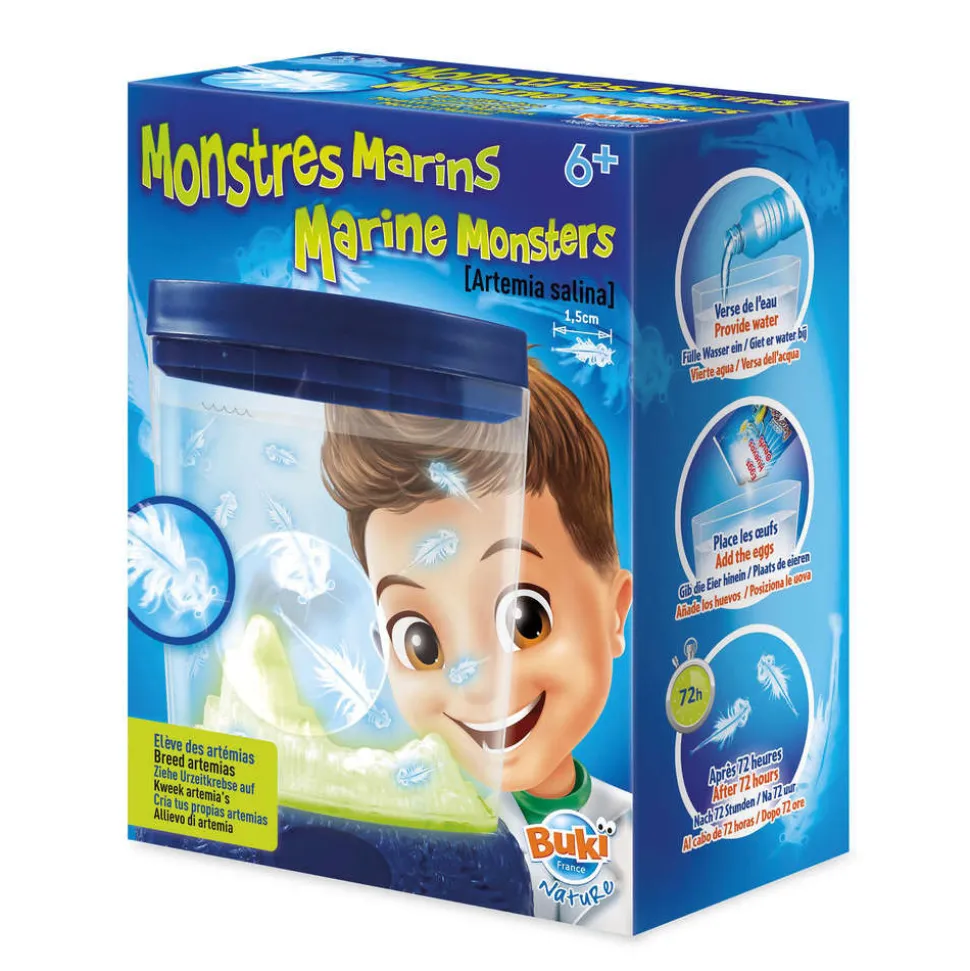Basés sur l窶冩bservation de la nature, la découverte des sciences et la créativité, les coffrets jeu Buki proposent aux enfants de nombreuses expériences et activités ludiques à réaliser en toute sécurité. Le coffret jeu Monstres marins destinés aux 6 ans et plus propose de faire éclore des émias dans un aquarium phosphorescent et de les observer à la loupe. Avec le jeu Monstres marins, les petits crustacés de marais n窶兮uront plus de secrets pour eux?! Le jeu Monstres marins peut se jouer en famille. Une belle idée cadeau?!
