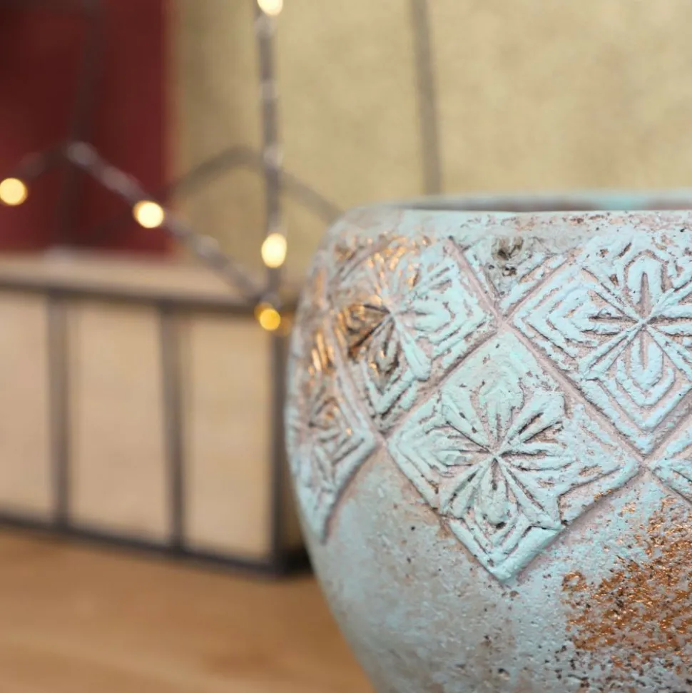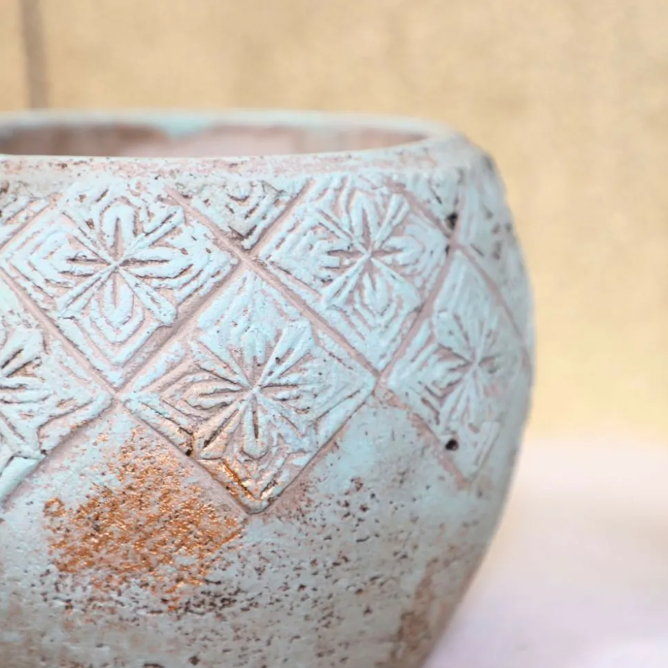 Couleur détaillée : Le cache-pot présente des nuances de vert de gris avec des tâches de cuivre, créant une apparence subtile et élégante. Les motifs de fleurs royales en relief ajoutent une touche de sophistication et de tradition à son design.