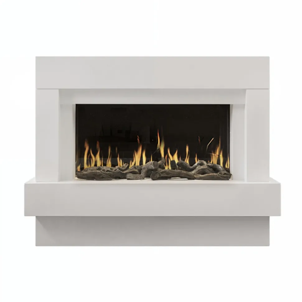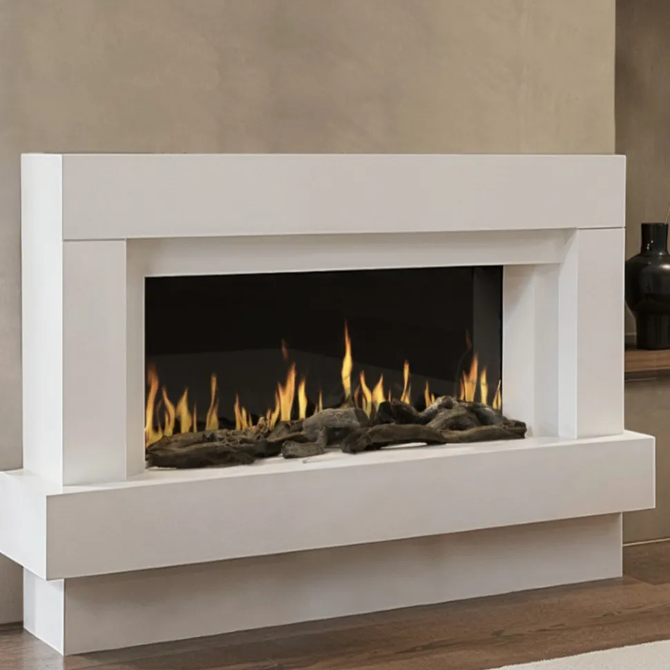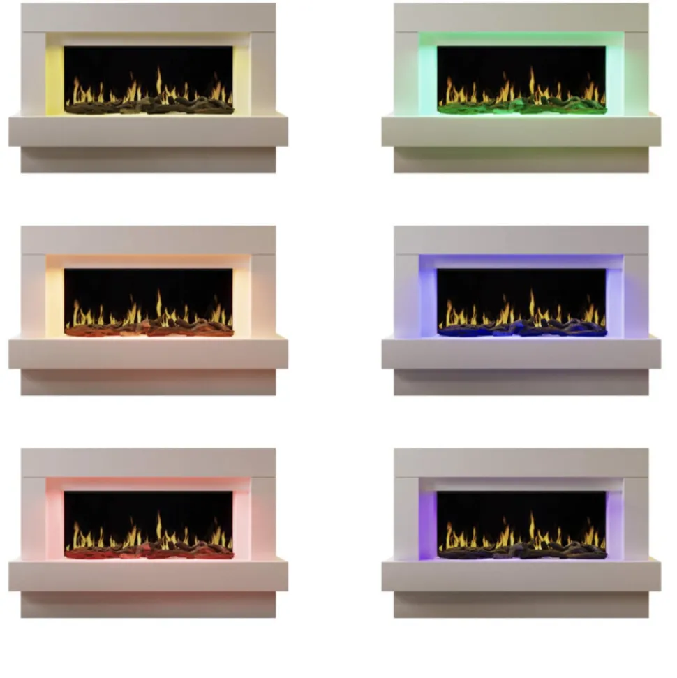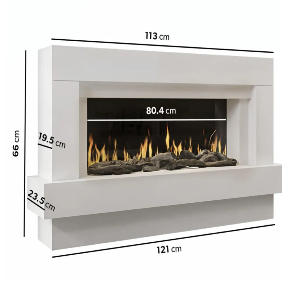 Cheminée électrique au design moderne et fonctionnel. Idéale pour réchauffer et décorer votre intérieur, la cheminée Linea combine design, performances et praticité. Découvrez ses nombreuses fonctionnalités et son esthétique épurée, parfaite pour sublimer votre pièce. Sa structure en MDF blanc et ses flammes LED réalistes en font un élément de décoration incontournable, alliant confort et élégance. Un design contemporain pour tous les intérieurs. Avec ses lignes épurées et sa finition en MDF blanc, cette cheminée s’intègre aussi bien dans un intérieur moderne que classique. Elle devient rapidement la pièce maîtresse de votre salon ou de votre chambre. Ses dimensions compactes (L.121 x P.24 x H.66 cm) permettent de l’installer facilement, même dans des espaces restreints, tout en conservant une présence visuelle marquée. Le rétroéclairage LED multicolore de la tablette supérieure ajoute une touche personnalisable à votre décoration, créant une ambiance lumineuse selon vos envies.Chauffage efficace et intelligent. Dotée d’une puissance de 2000W, cette cheminée chauffe efficacement les espaces tout en offrant un confort d’utilisation grâce à son thermostat réglable. La diffusion de la chaleur par l’avant assure une répartition homogène dans la pièce. Le chauffage est expulsé en façade L’air sort discrètement par le côté intérieur du cadre supérieur afin de donner l’illusion que la source de chaleur provient du foyer. La programmation horaire, qu’elle soit journalière ou hebdomadaire, permet une gestion précise de vos besoins en chauffage, avec une utilisation intuitive grâce à la télécommande ou au contrôle Wifi. La protection contre la surchauffe garantit une sécurité optimale, pour une utilisation sans souci au quotidien.Une ambiance chaleureuse grâce aux flammes LED. La technologie LED de la cheminée Linea recrée des flammes d’un réalisme impressionnant, offrant une atmosphère chaleureuse et conviviale à votre espace de vie. Les bûches décoratives fournies ajoutent un cachet authentique, rappelant l’aspect traditionnel des cheminées à bois, sans les inconvénients de l’entretien. Le rétroéclairage multicolore permet de varier les ambiances lumineuses, pour des moments cosy en famille ou entre amis.