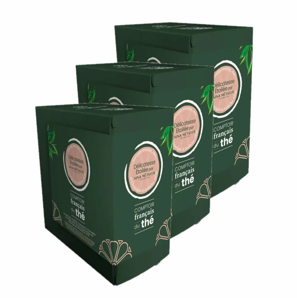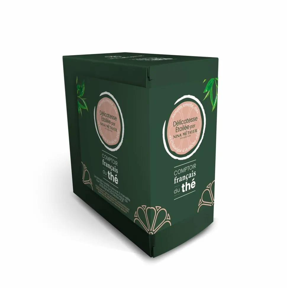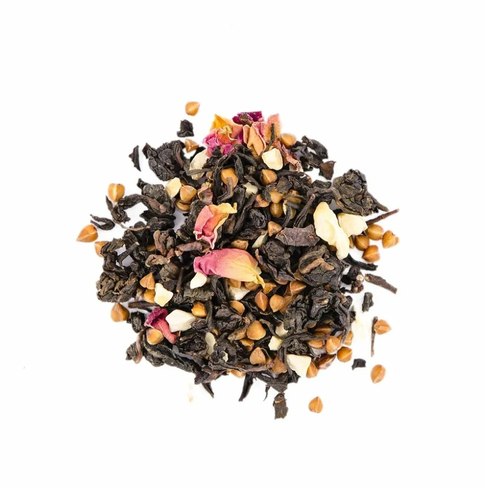 Graines de sarrasin décortiquées grillées 57,5%, thé 19% (thé noir et thé noir fumé), morceaux de châtaigne d’Ardèche AOP 10%, arômes, écorces d’orange, morceaux de cannelle