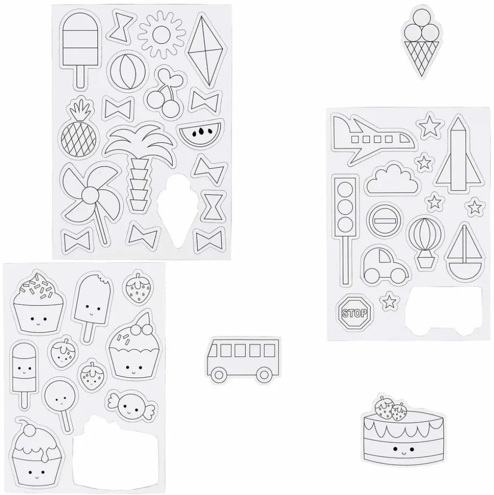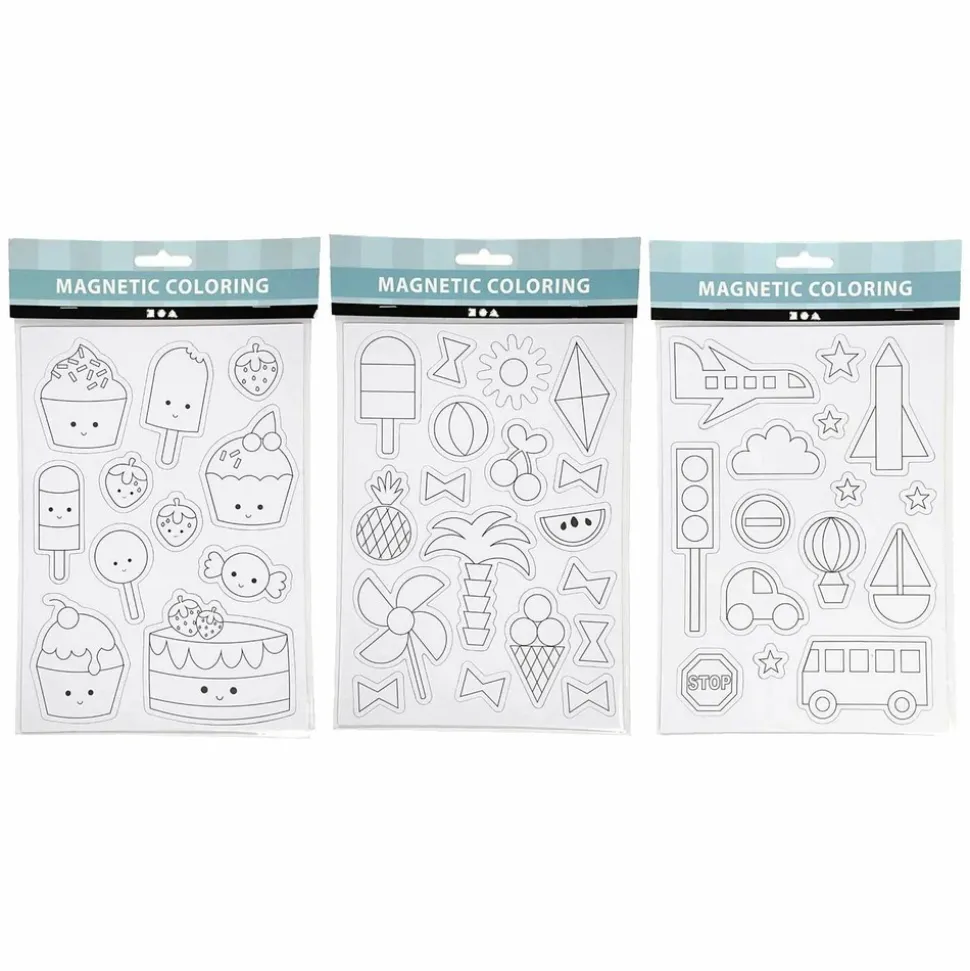 3 planches de magnets blancs à personnaliser. Ces figurines magnétiques de la marque Creotime sont sur le thème des transports, de l’été et de la gourmandise. Voici les motifs présents : avion, fusée, bus, bateau, voiture, montgolfière, étoiles, panneaux de circulation, glaces, soleil, ananas, cerf-volant, cupcakes, glaces, bonbons. Ces magnets sont blancs avec des traits tracés pour bien reconnaitre les objets. Amusez-vous à les colorier avec des feutres ou des crayons de couleur, ajouter des stickers ou jouer avec des tampons et des paillettes. Ce sera une activité manuelle parfaite pour les enfants ! Les magnets mesurent entre 14,5 et 21 cm.
